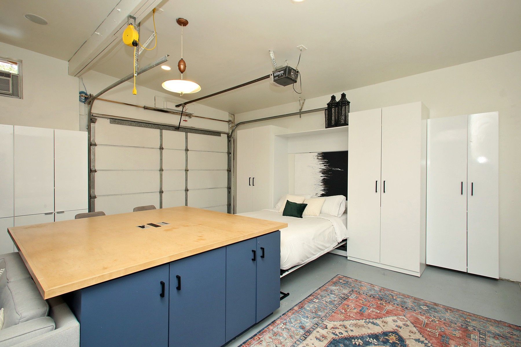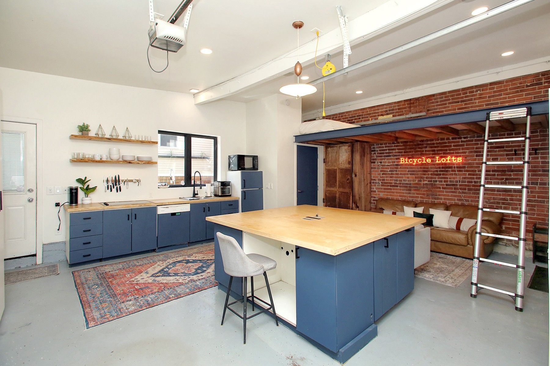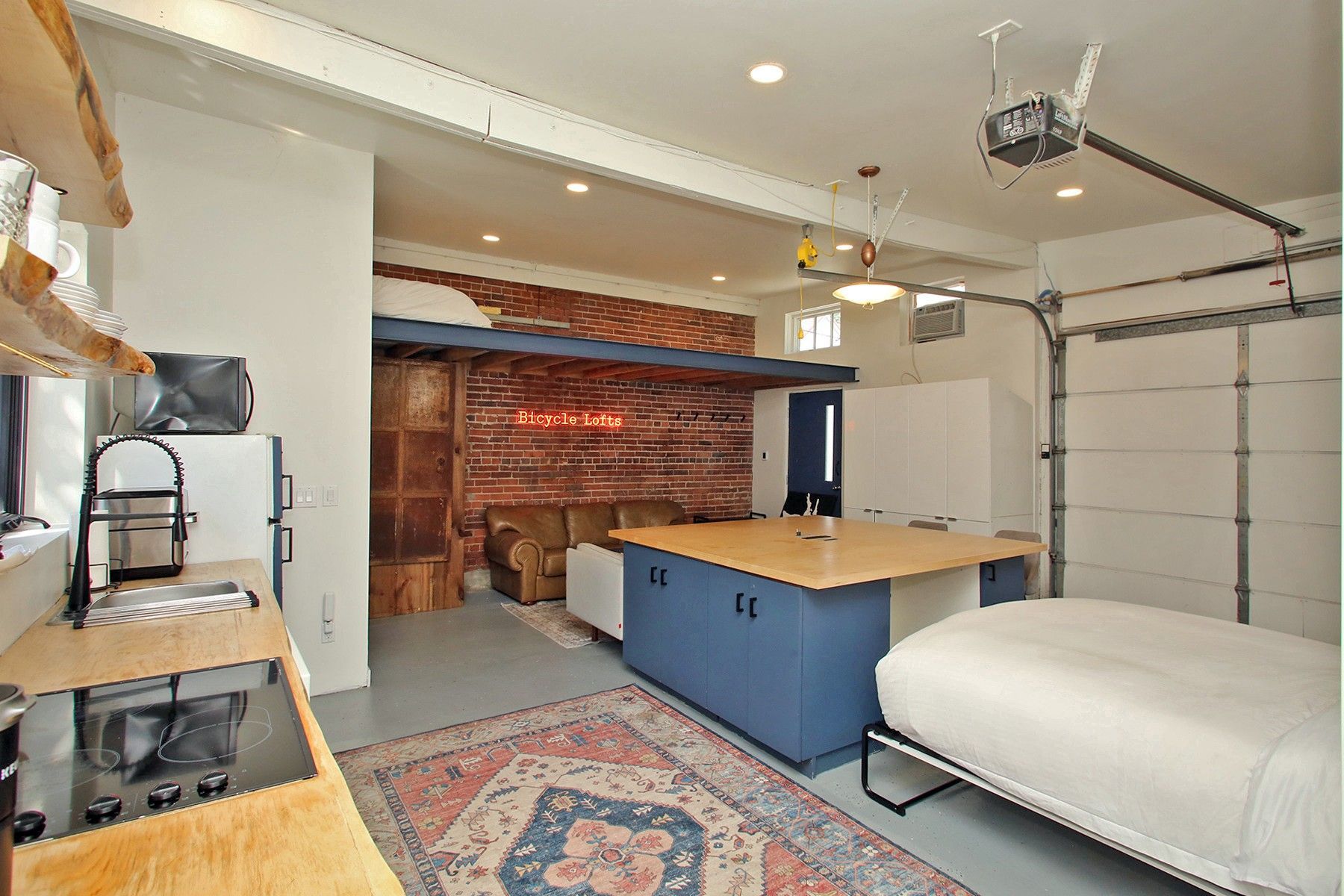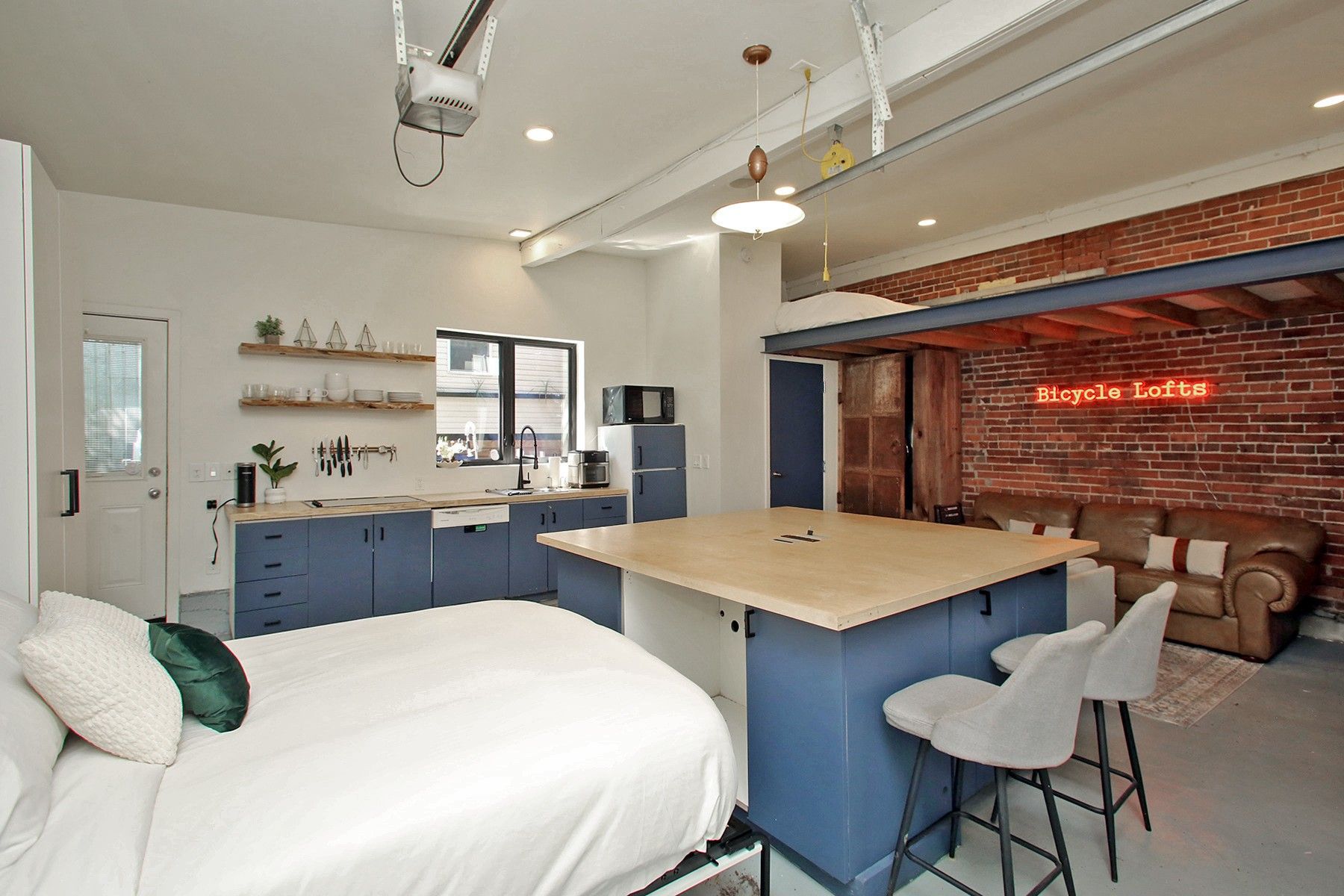 Step inside to discover soaring ceilings and exposed brick walls that create an atmosphere of industrial elegance. The cleverly designed space features a premium murphy bed with a plush pillowtop mattress, flanked by generous closets perfect for organized living. The ingenious layout includes a substantial center island that adapts seamlessly to your needs, whether you're working from home, pursuing creative projects, or sharing a meal with friends.