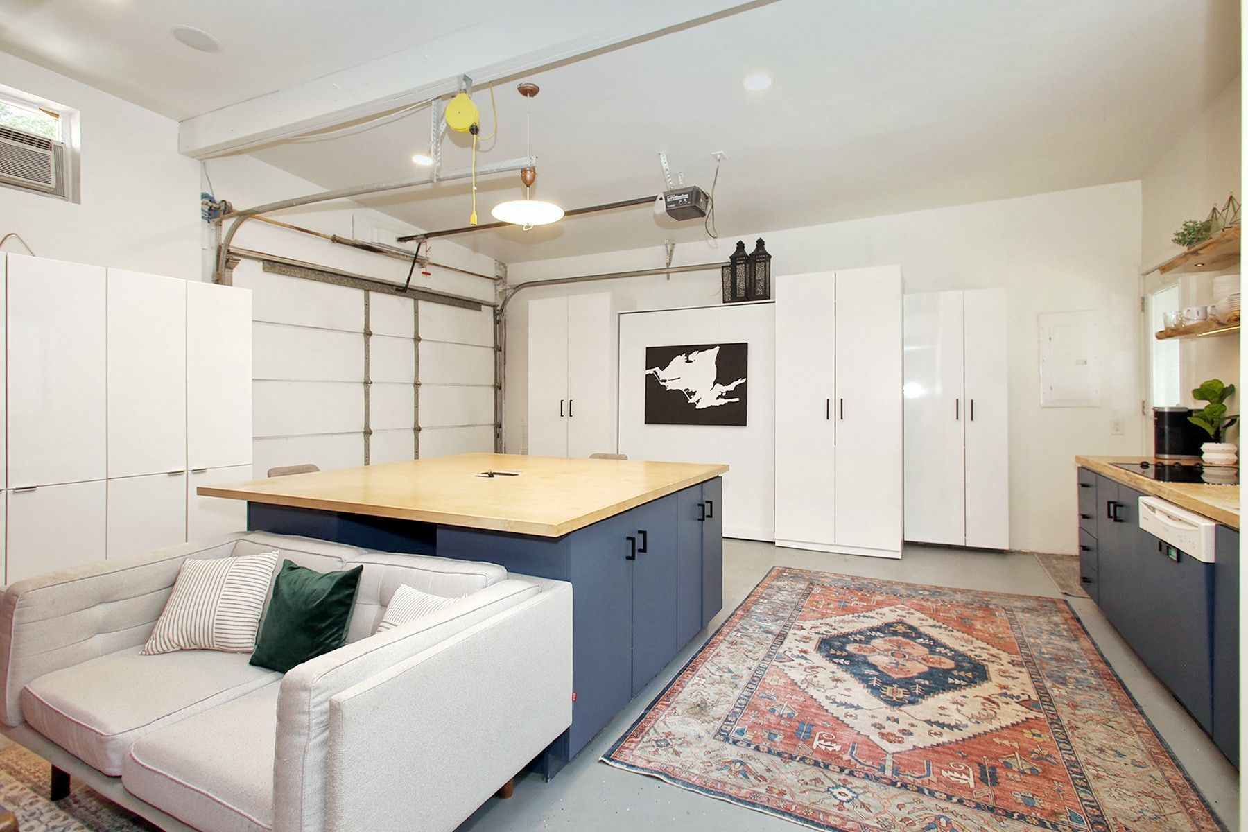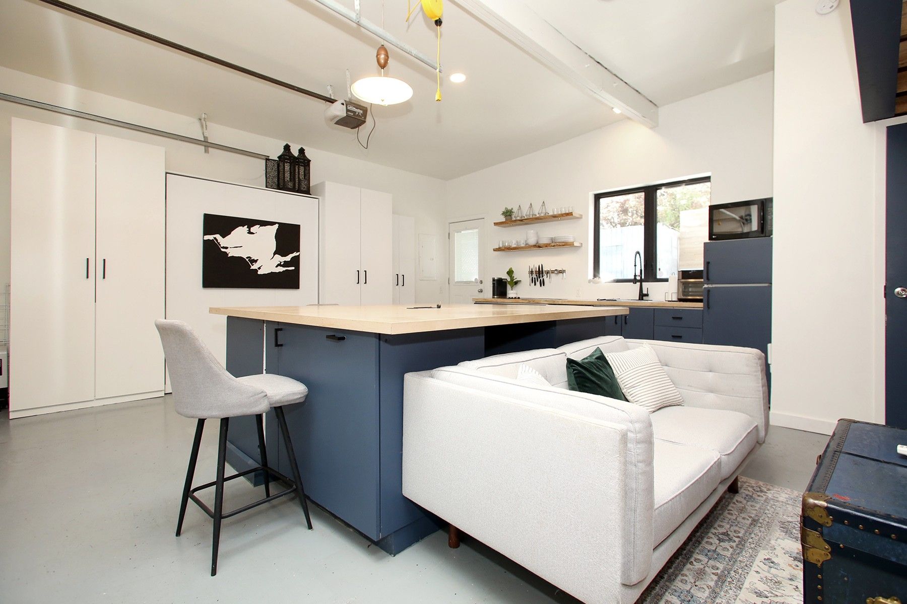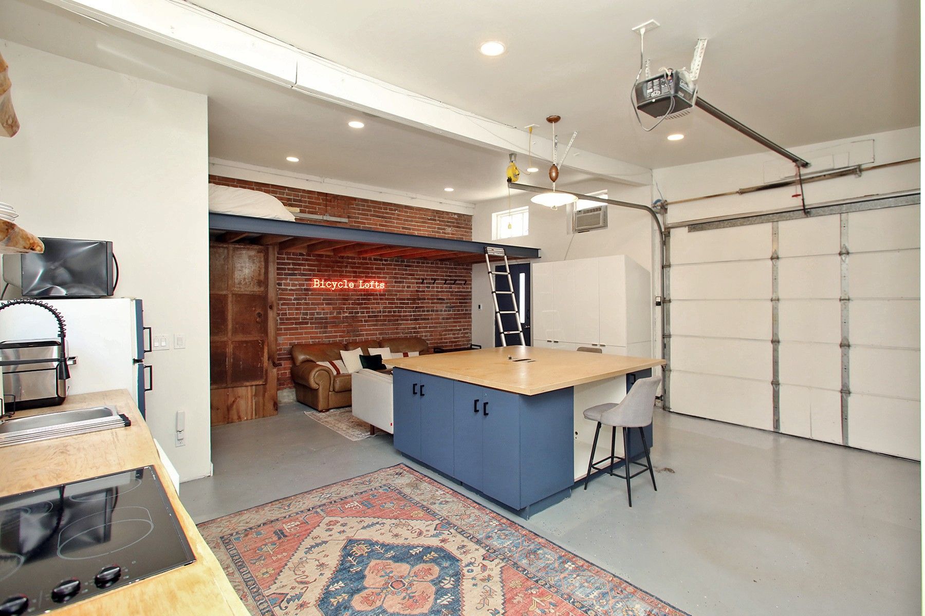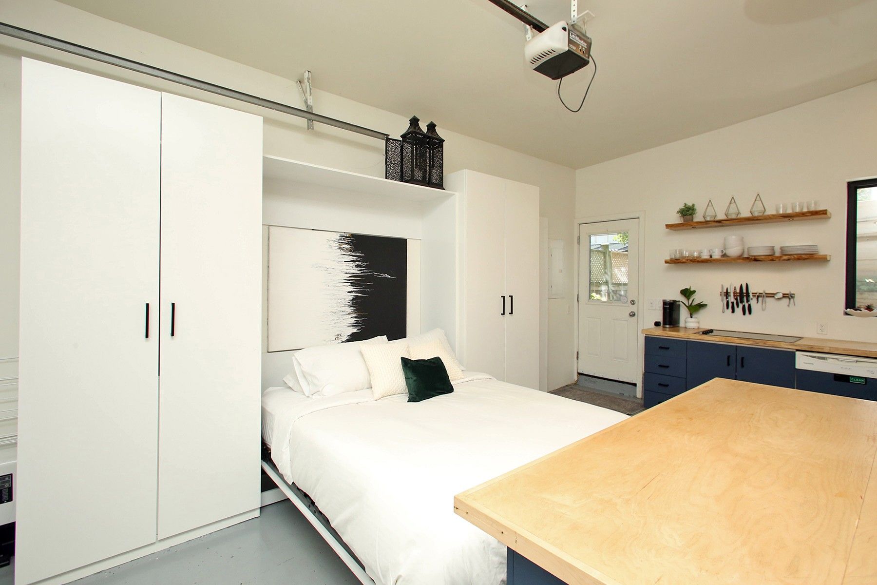 Step inside to discover soaring ceilings and exposed brick walls that create an atmosphere of industrial elegance. The cleverly designed space features a premium murphy bed with a plush pillowtop mattress, flanked by generous closets perfect for organized living. The ingenious layout includes a substantial center island that adapts seamlessly to your needs, whether you're working from home, pursuing creative projects, or sharing a meal with friends.