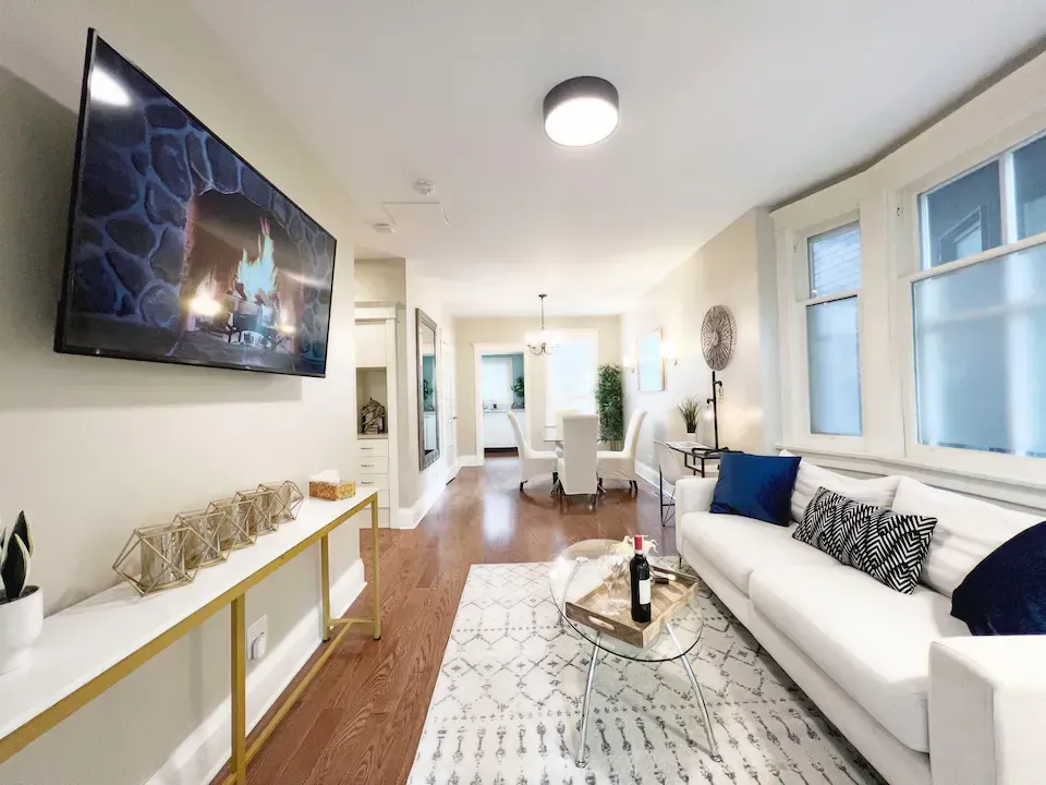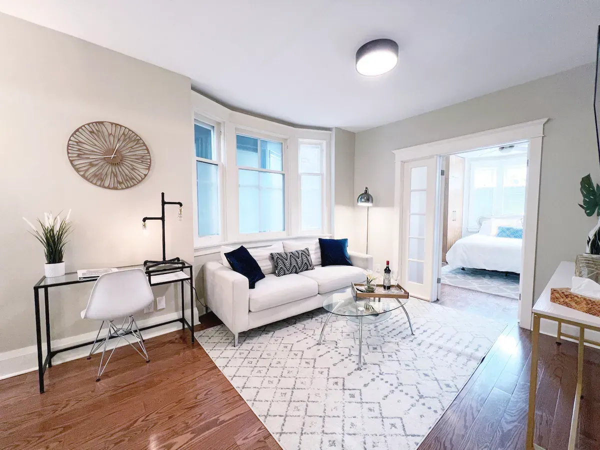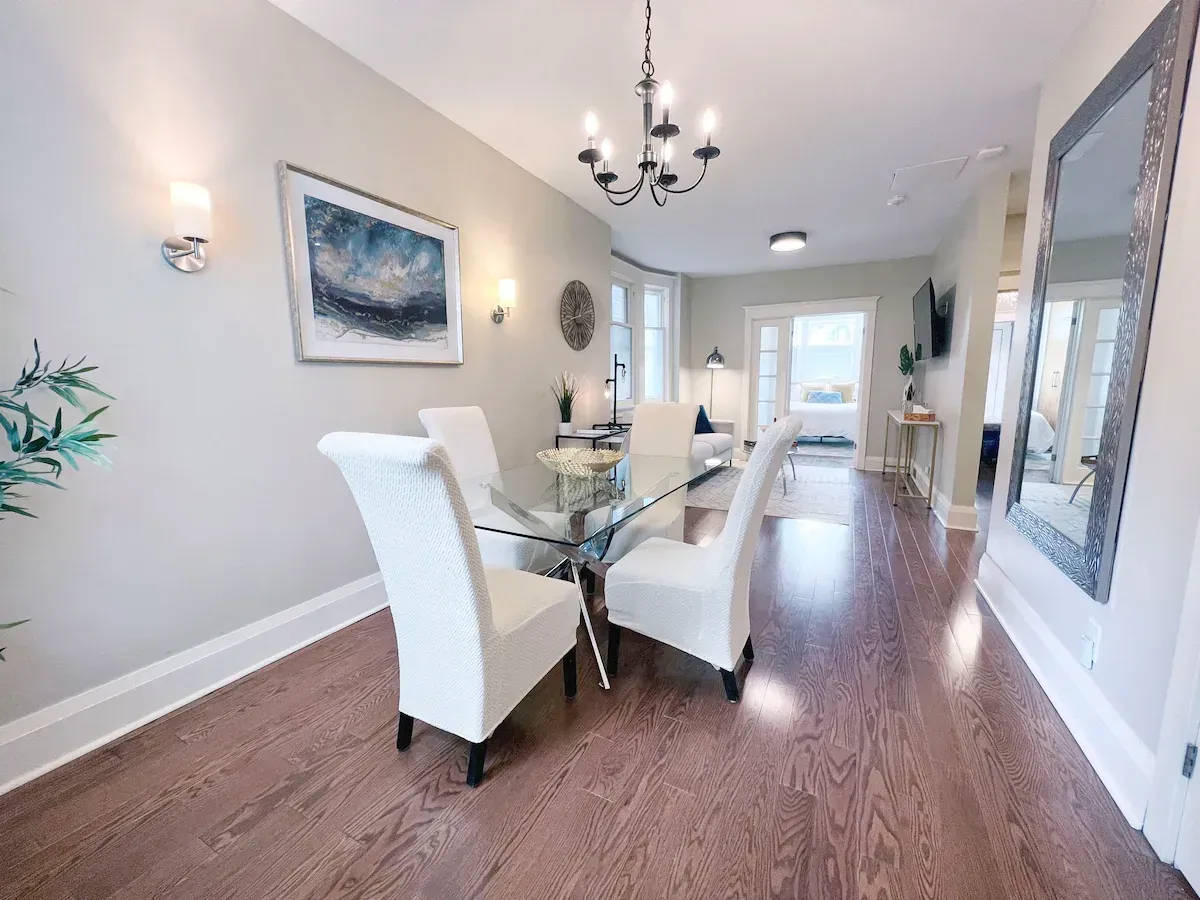 Walk through the front door into your private, lockable, main floor suite – a stylish yet homely retreat. High ceilings and an open-plan design make the heart of the suite feel spacious and inviting. Here, you'll find a cozy living area with a 55" TV, perfect for relaxing after a long day of exploring Toronto.