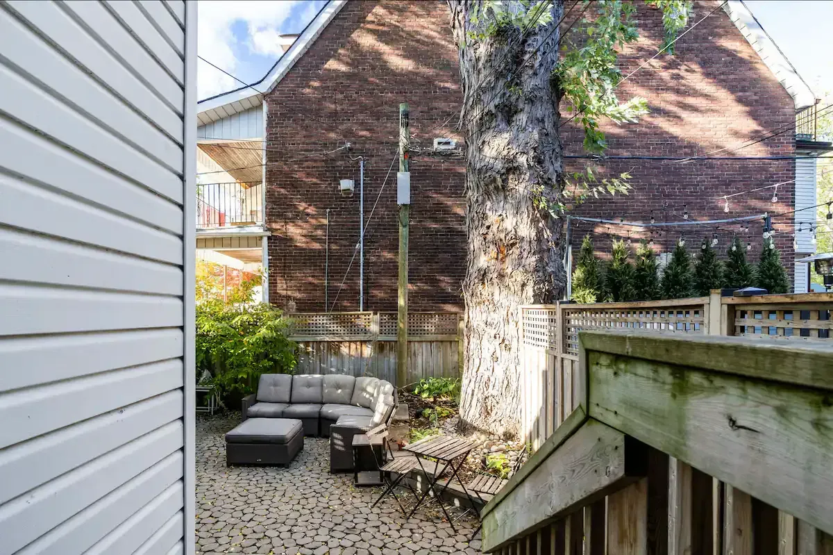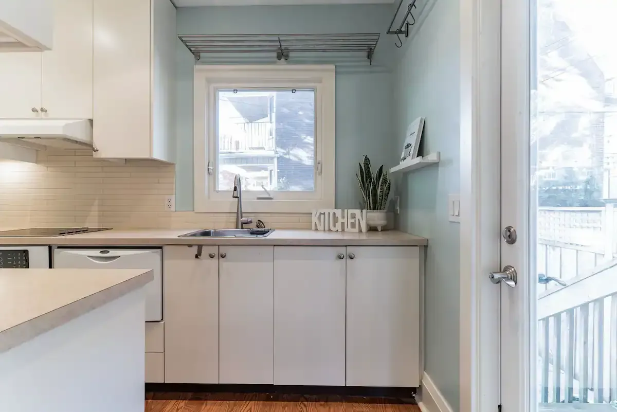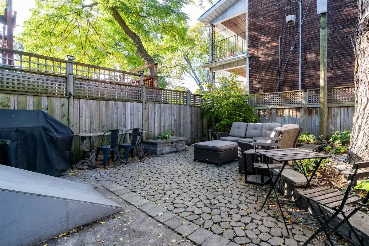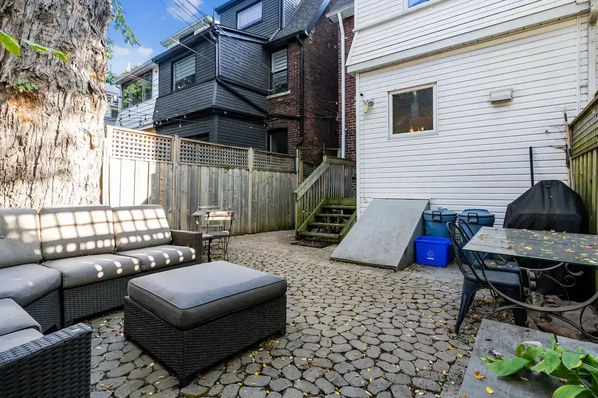Off to one side lies a sunny bedroom, equipped with a comfortable queen bed and ample built-in storage. Allowing for a peaceful night's rest and plenty of space for your belongings. Tucked away at the back, a fully-equipped galley-style kitchen awaits. It features high-end Jenn-Air appliances and ample storage space, including large pantry-style cupboards. The kitchen overlooks a patio stone backyard, offering a lovely view of a 100+ year old maple tree. The private backyard, accessible directly from your suite, is a highlight. Complete with a BBQ, outdoor sectional seating, and a majestic century-old maple tree overhead, this space is perfect for al fresco dining or simply unwinding outdoors. And if you're bringing along a furry friend, they'll love it too, as our suite is pet-friendly! Please note, while our perimeter planter bed and lighting is still a work in progress, its rustic charm still adds a unique touch to the backyard space. Welcome to your luxurious yet homey retreat in vibrant Danforth, Toronto.
