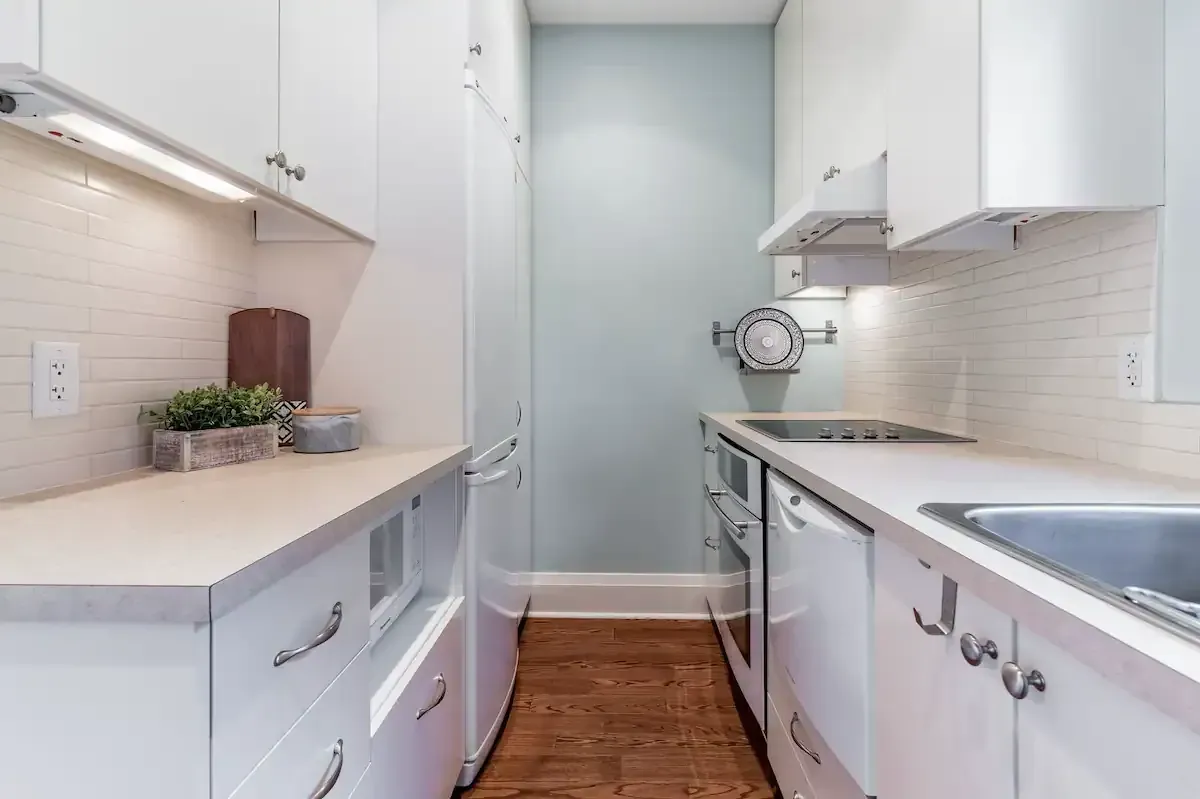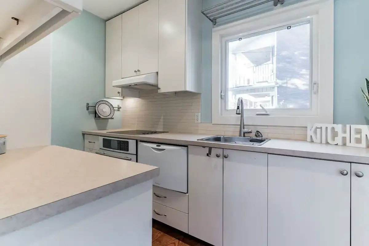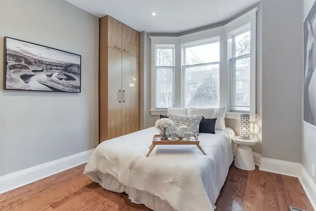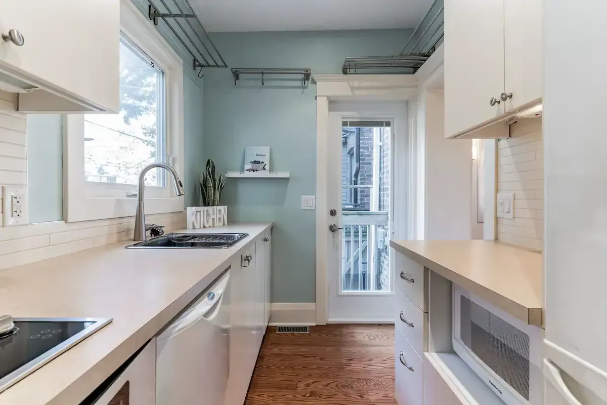 Off to one side lies a sunny bedroom, equipped with a comfortable queen bed and ample built-in storage. Allowing for a peaceful night's rest and plenty of space for your belongings. Tucked away at the back, a fully-equipped galley-style kitchen awaits. It features high-end Jenn-Air appliances and ample storage space, including large pantry-style cupboards. The kitchen overlooks a patio stone backyard, offering a lovely view of a 100+ year old maple tree. The private backyard, accessible directly from your suite, is a highlight. Complete with a BBQ, outdoor sectional seating, and a majestic century-old maple tree overhead, this space is perfect for al fresco dining or simply unwinding outdoors. And if you're bringing along a furry friend, they'll love it too, as our suite is pet-friendly! Please note, while our perimeter planter bed and lighting is still a work in progress, its rustic charm still adds a unique touch to the backyard space. Welcome to your luxurious yet homey retreat in vibrant Danforth, Toronto.