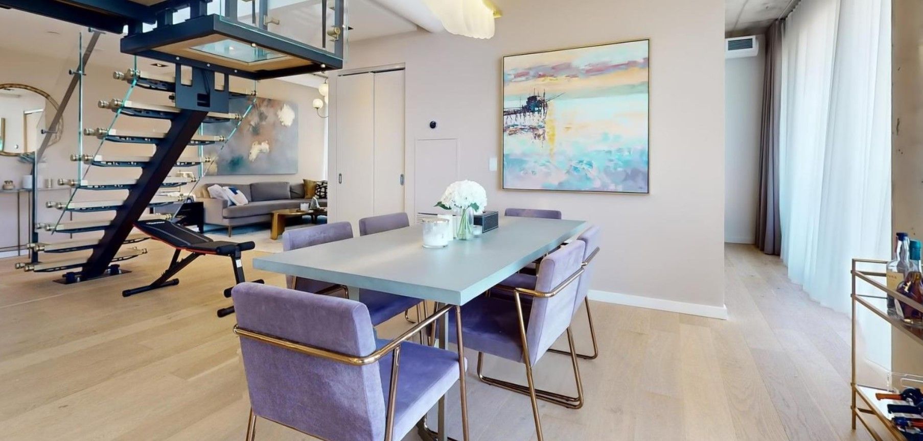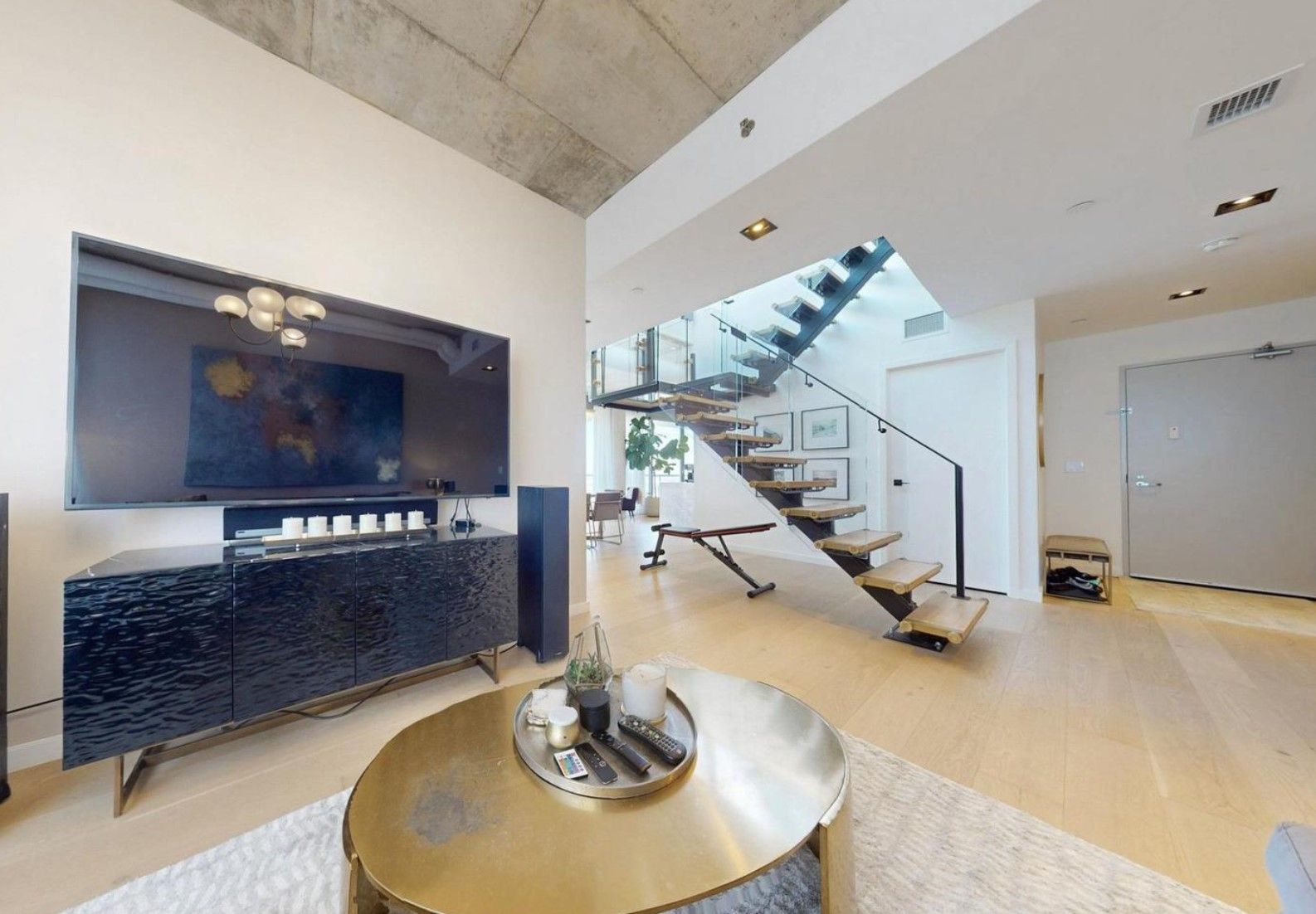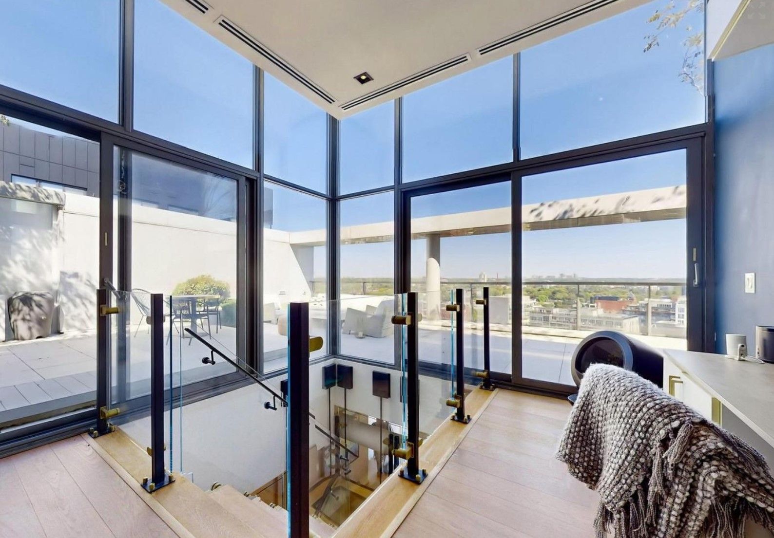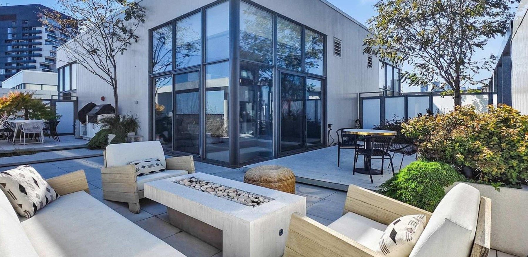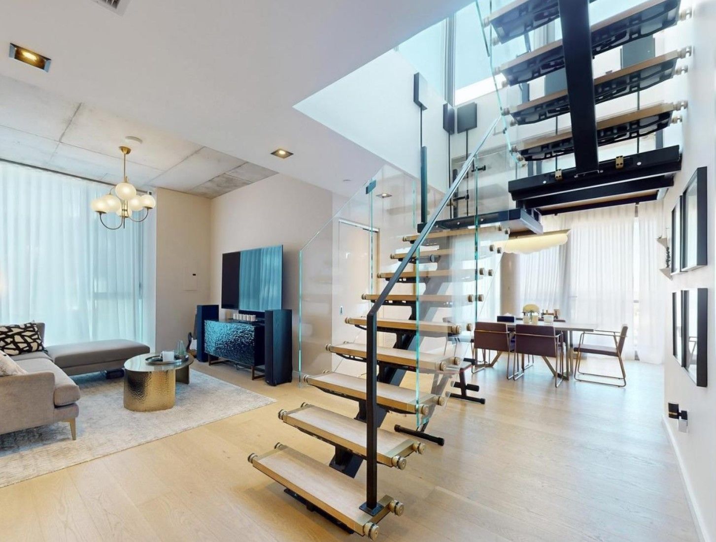 Upon entry, an architectural statement sets the tone, a striking floating wood and metal staircase with glass railings introduces the home’s contemporary elegance. The main level unfolds seamlessly, with expansive living and dining areas opening onto a remarkable 55-foot balcony spanning 197 sq. ft. and offering three separate walk-outs. Bathed in natural light, the space feels bright, airy, and inviting. The gourmet kitchen overlooks the living area, creating a natural hub for gatherings both large and intimate. Two well-appointed bedrooms and two full bathrooms are discreetly positioned on the main floor, separated by the kitchen and dining areas for added privacy. The primary suite serves as a true retreat, featuring a spa-inspired ensuite and a generous walk-in closet. Every element of this home has been professionally redesigned and renovated to elevate both style and comfort, delivering a truly turnkey living experience. Upstairs, a sun-filled den opens onto an extraordinary 1,174 sq. ft. private terrace, professionally landscaped and furnished for seamless outdoor living. Complete with a built-in BBQ, multiple lounging areas, and ample space for entertaining or quiet evenings under the sky, this outdoor oasis is nothing short of exceptional. More than a home, this residence offers a lifestyle. With its rare combination of interior luxury and unparalleled outdoor living, this penthouse presents a unique opportunity to embrace urban sophistication at its finest.
