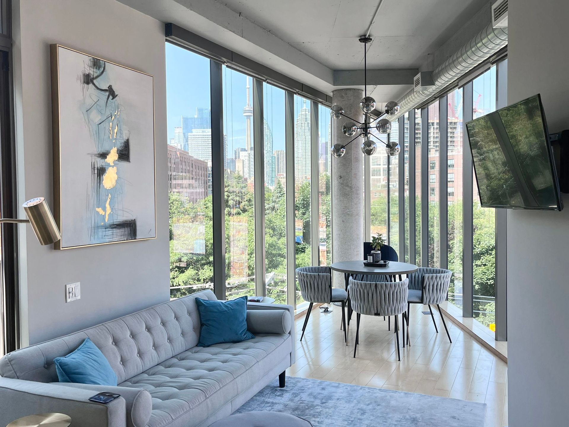 Stunning 1+1 Bedroom Fully Furnished Rental in Distillery District with Panoramic City Views modern and luxurious living experience in the heart of the vibrant Distillery District. This exclusive property showcases unparalleled features and boasts breathtaking unobstructed panoramic views of the iconic CN Tower and city skyline. Step inside this exceptional residence and be enchanted by the floor-to-ceiling windows, flooding the space with an abundance of natural light. The open concept layout seamlessly integrates the living, dining, and kitchen areas, creating a perfect space for entertaining or simply enjoying family time. Situated in the highly sought-after Distillery District, this home offers an unparalleled location with an abundance of nearby attractions. Explore the vibrant neighborhood filled with charming cobblestone streets, trendy shops, and a diverse selection of restaurants, cafes, and bars.