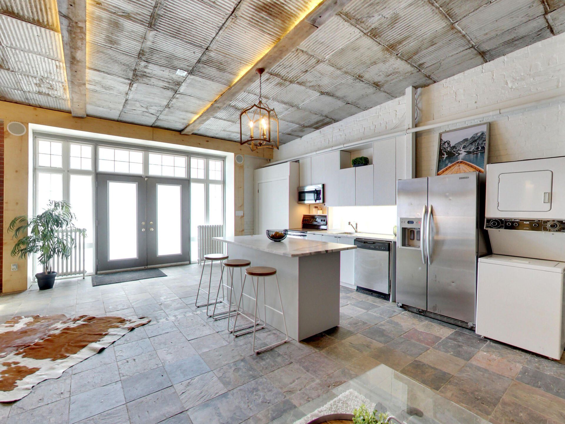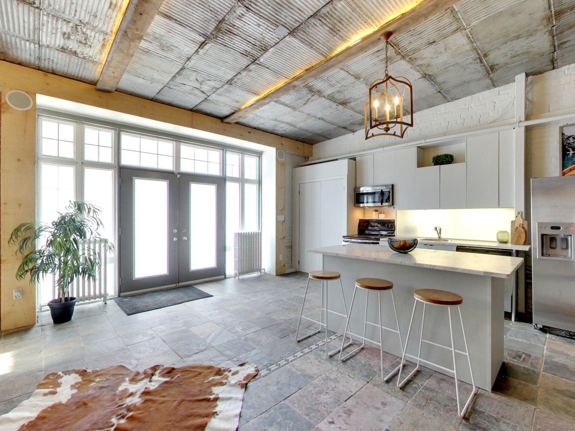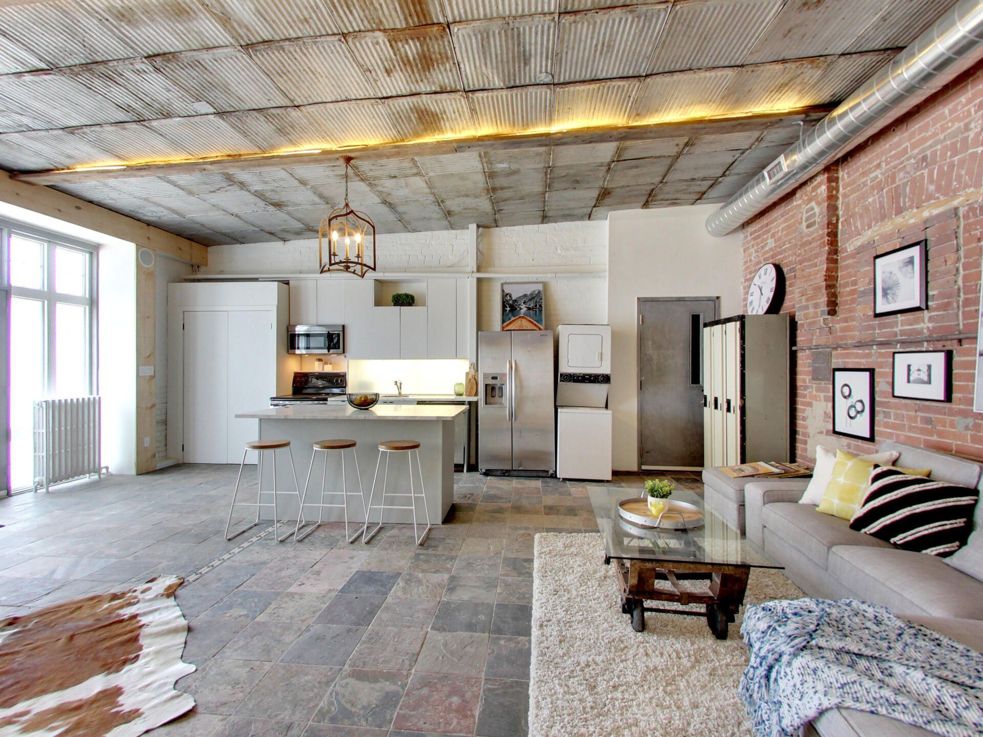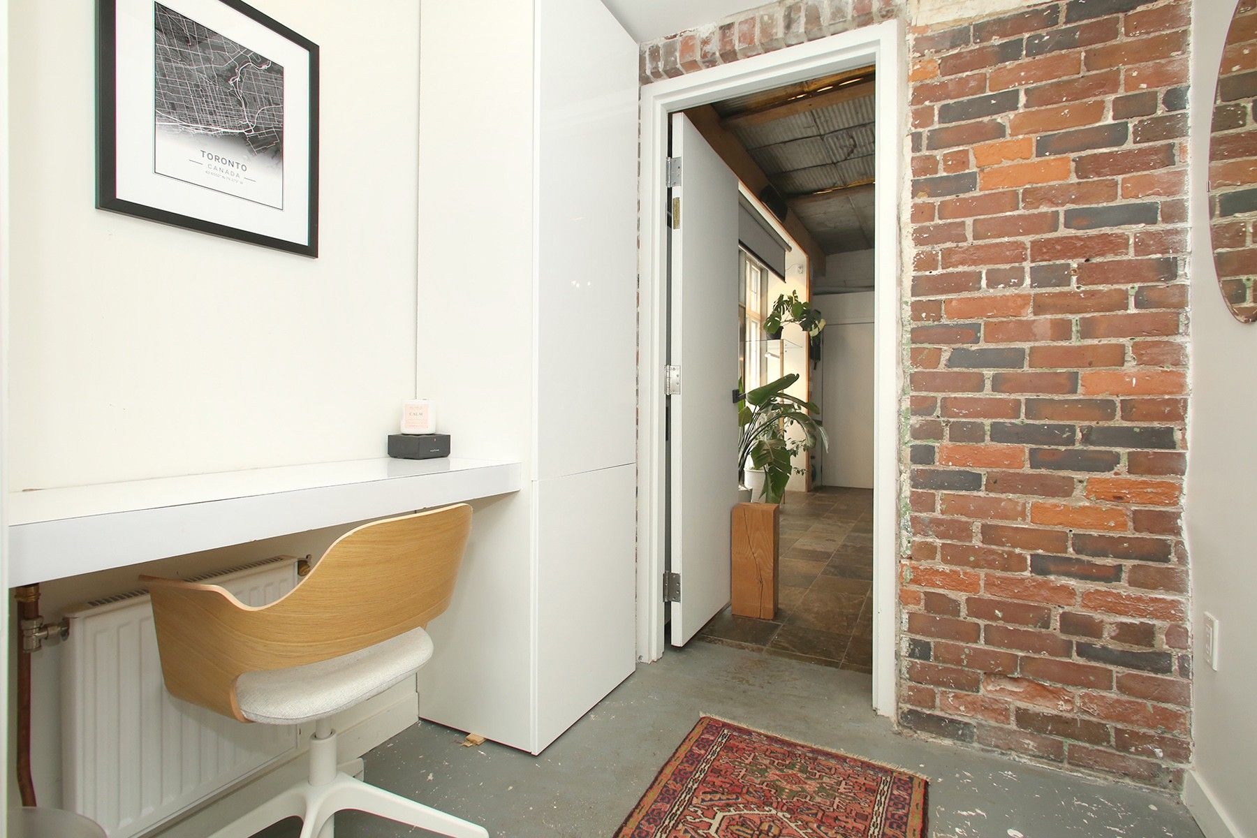 Step inside this one-of-a-kind, unique LOFT in the heart of Leslieville. The 11 foot, repurposed tin ceilings, and open concept layout offer a spacious feel. Heated bathroom floors and a crackling wood-burning fireplace make those winter nights cozy. In-suite laundry, dishwasher, ice maker fridge make your home comfortable. A bright Skylight and Air conditioning make summer days comfortable. There is an additional 200 sq ft Loft storage space above the bedroom. Work from home with custom-built desk and thick industrial door closing this space off to the rest of the house.