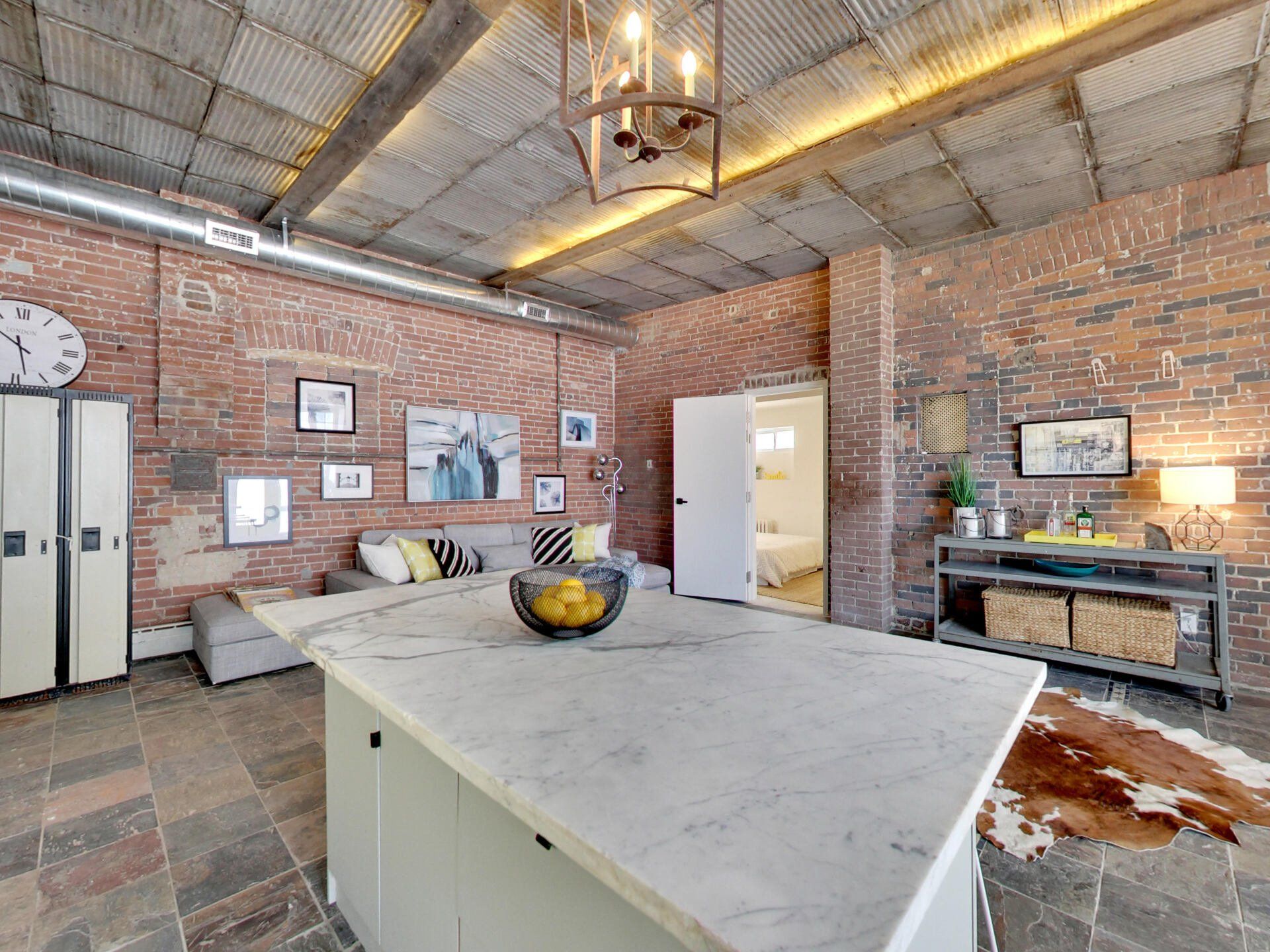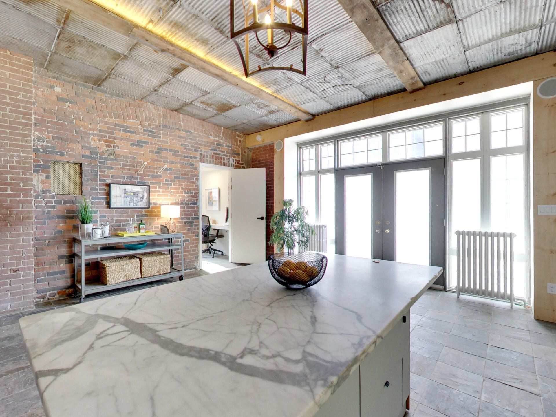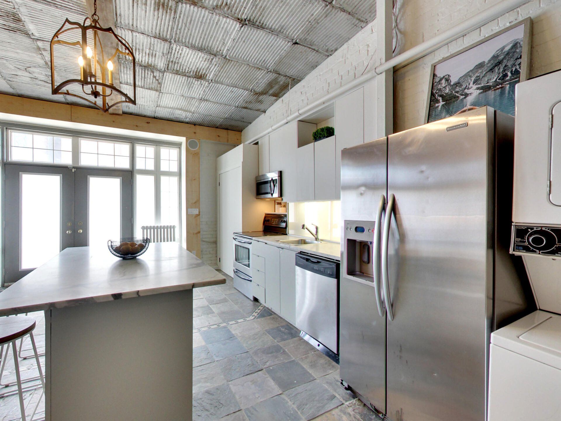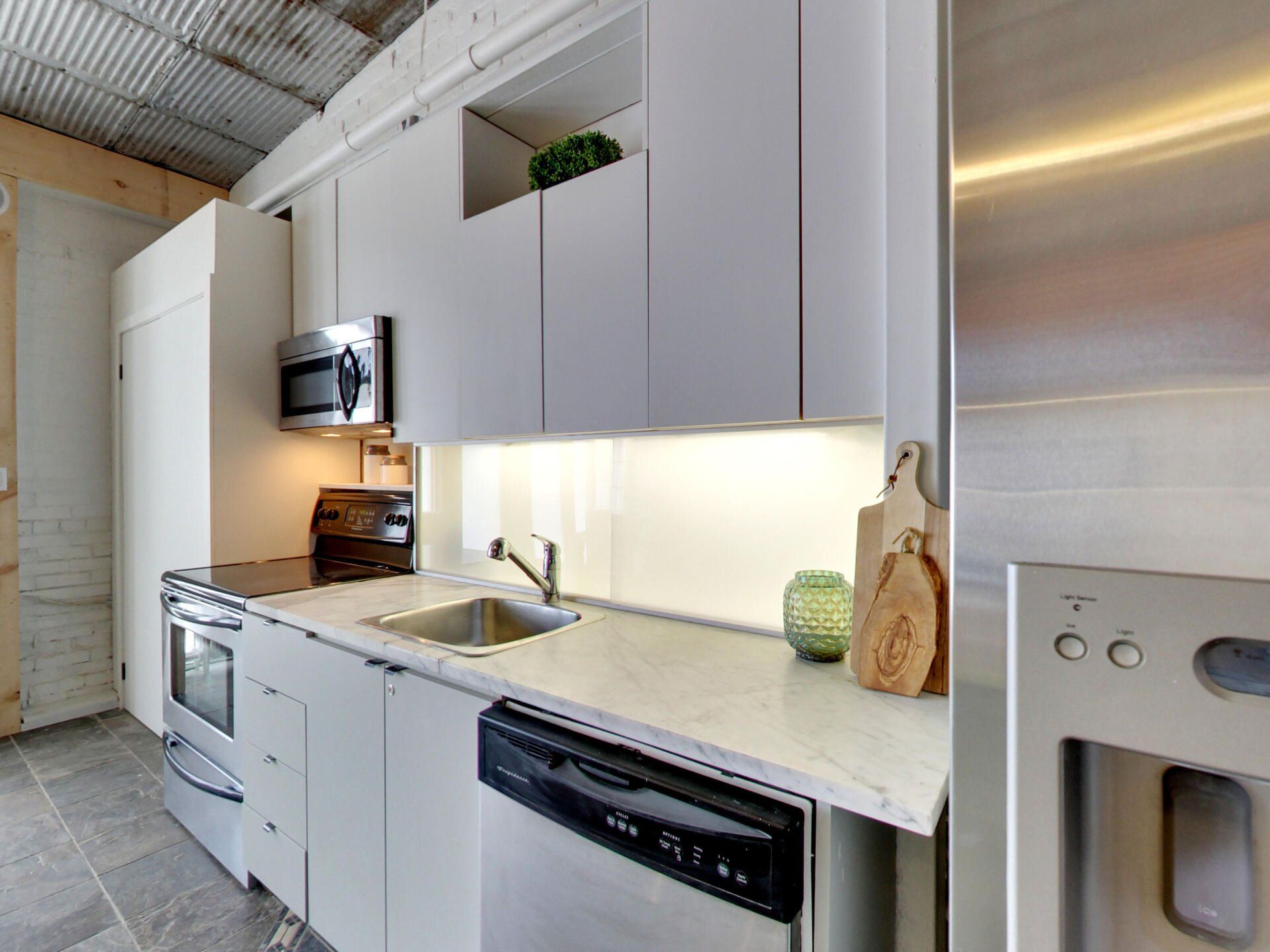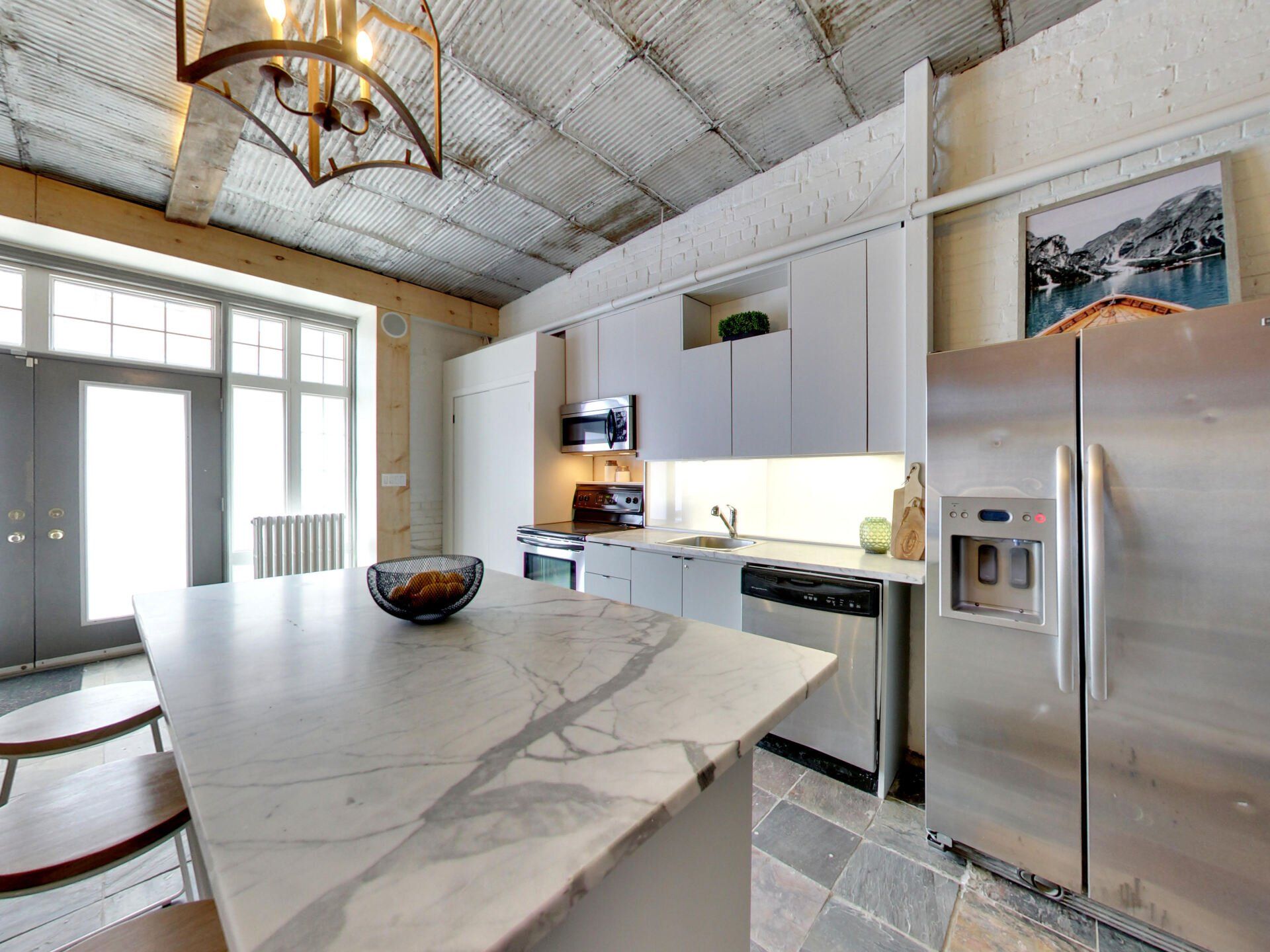 Step inside this one-of-a-kind, unique LOFT in the heart of Leslieville. The 11 foot, repurposed tin ceilings, and open concept layout offer a spacious feel. Heated bathroom floors and a crackling wood-burning fireplace make those winter nights cozy. In-suite laundry, dishwasher, ice maker fridge make your home comfortable. A bright Skylight and Air conditioning make summer days comfortable. There is an additional 200 sq ft Loft storage space above the bedroom. Work from home with custom-built desk and thick industrial door closing this space off to the rest of the house.
