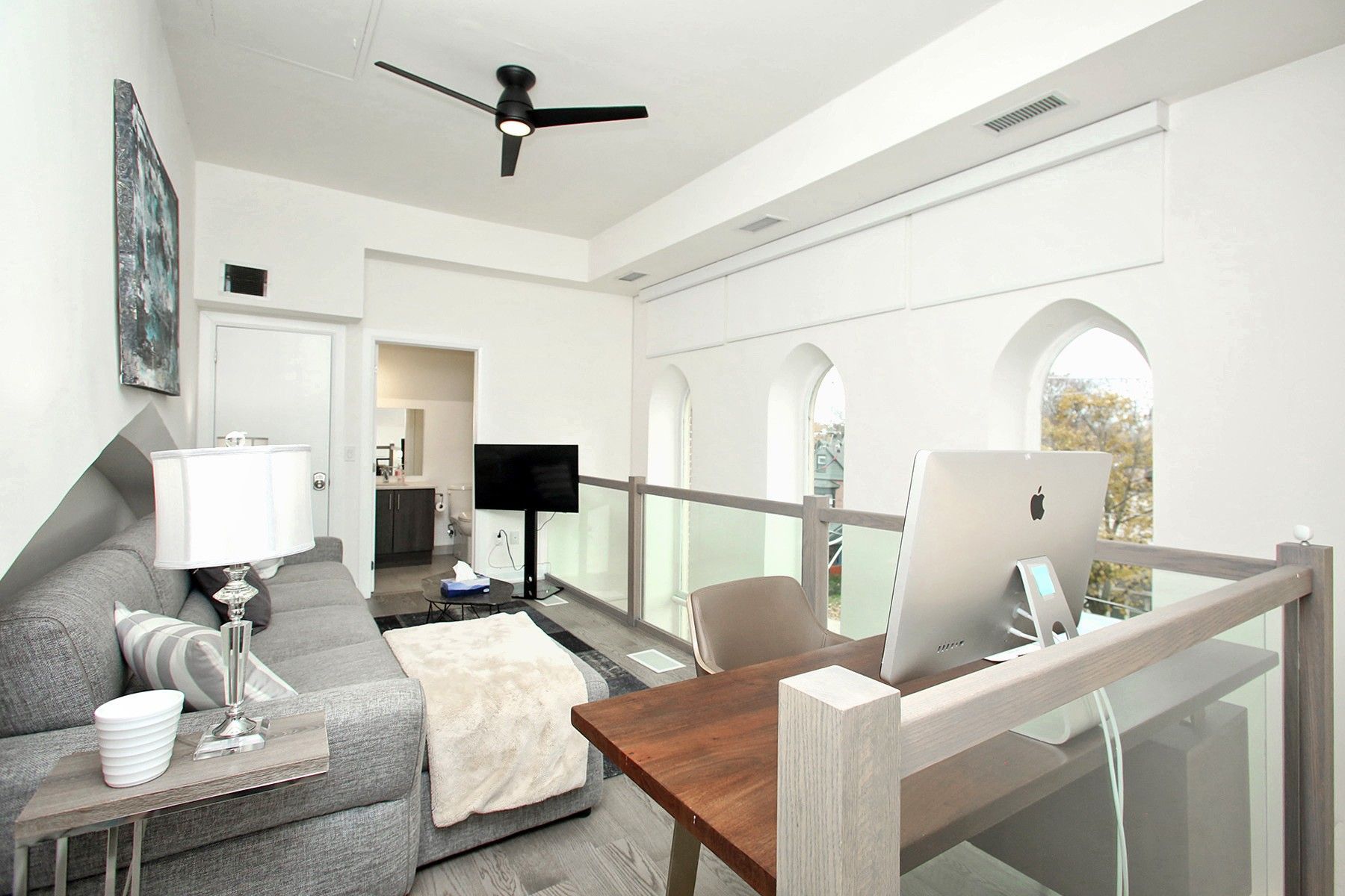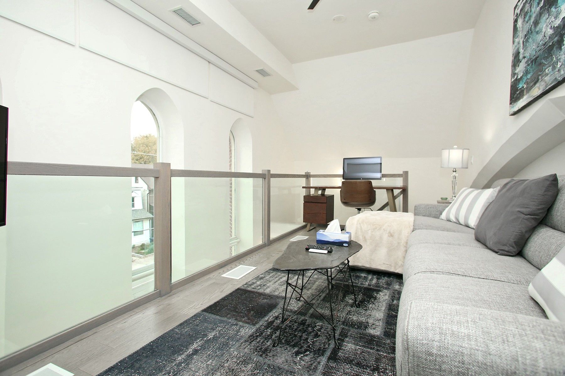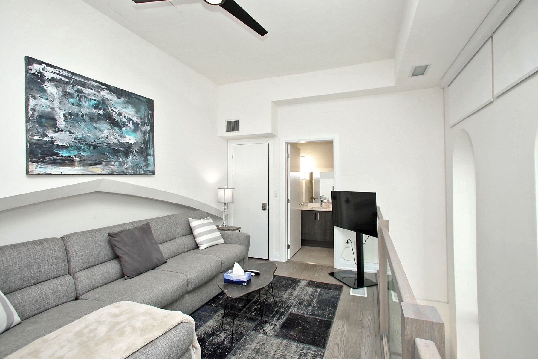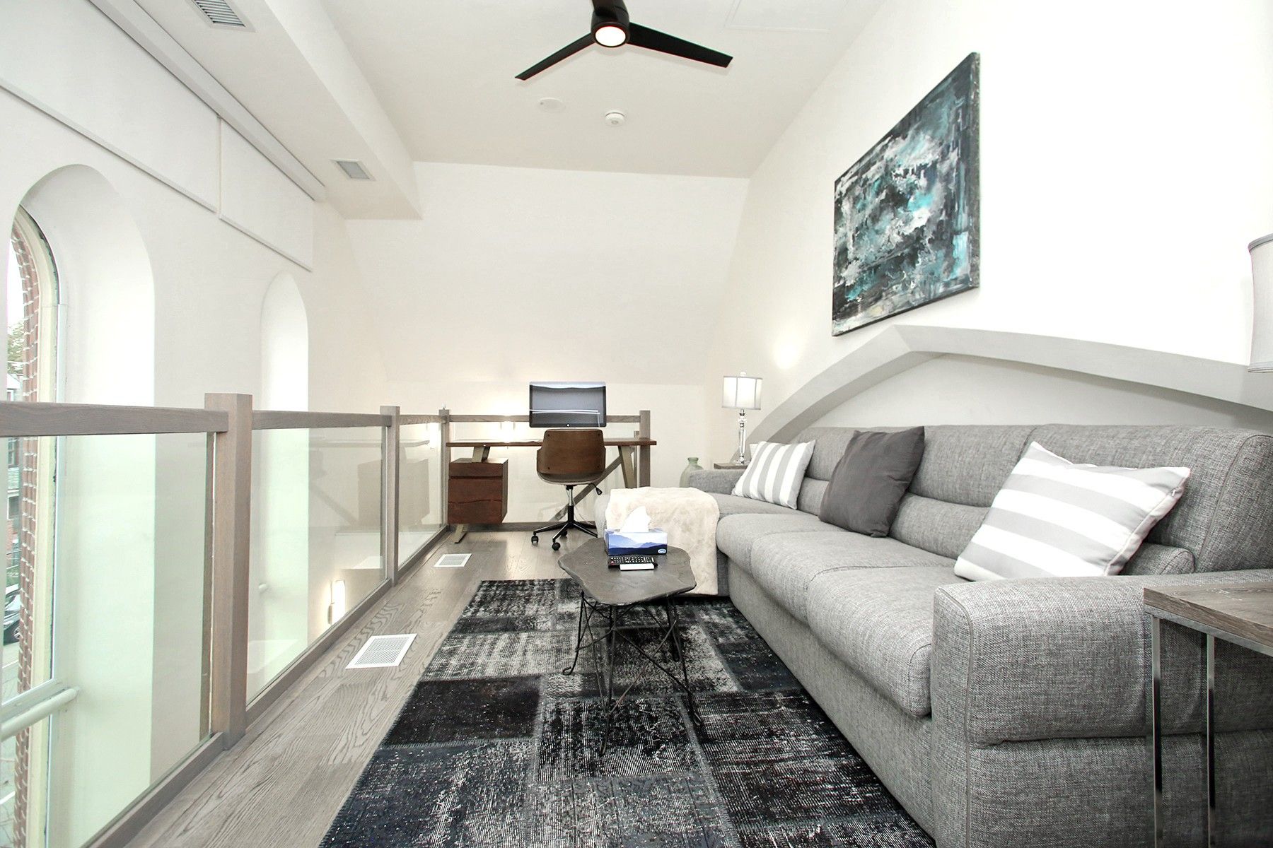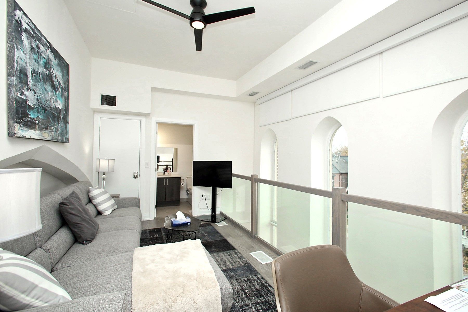 Spanning over two stories are 5 picturesque lancet windows offering loads of light. The unit boasts one bedroom plus a den, two full bathrooms, and three stories of living space. On the upper level is the loft-style living room + den, with a glass railing to overlook the impressive three lancet windows and second-level furnishings. On the 2nd level, you will find the primary bedroom, a coffee and bar area, full bathroom, and an open concept kitchen with waterfall island and an additional sitting/living area. Make your way down to the ground level and you'll find a welcoming entry with discrete laundry and ample space for inside/outside wear. This property is just steps away from some of Toronto's best restaurants, shops, and fitness centers!