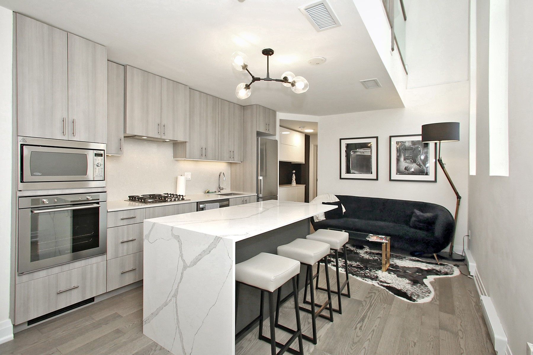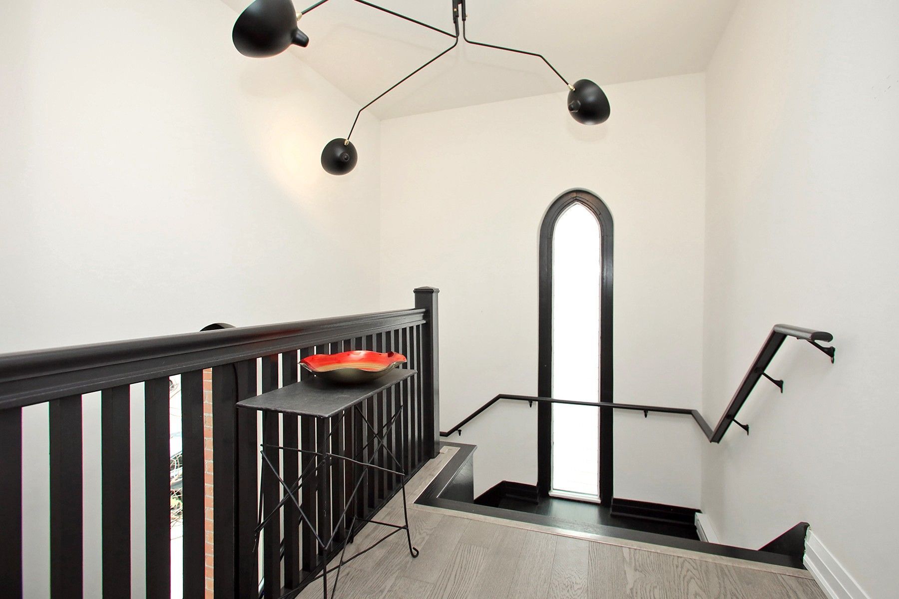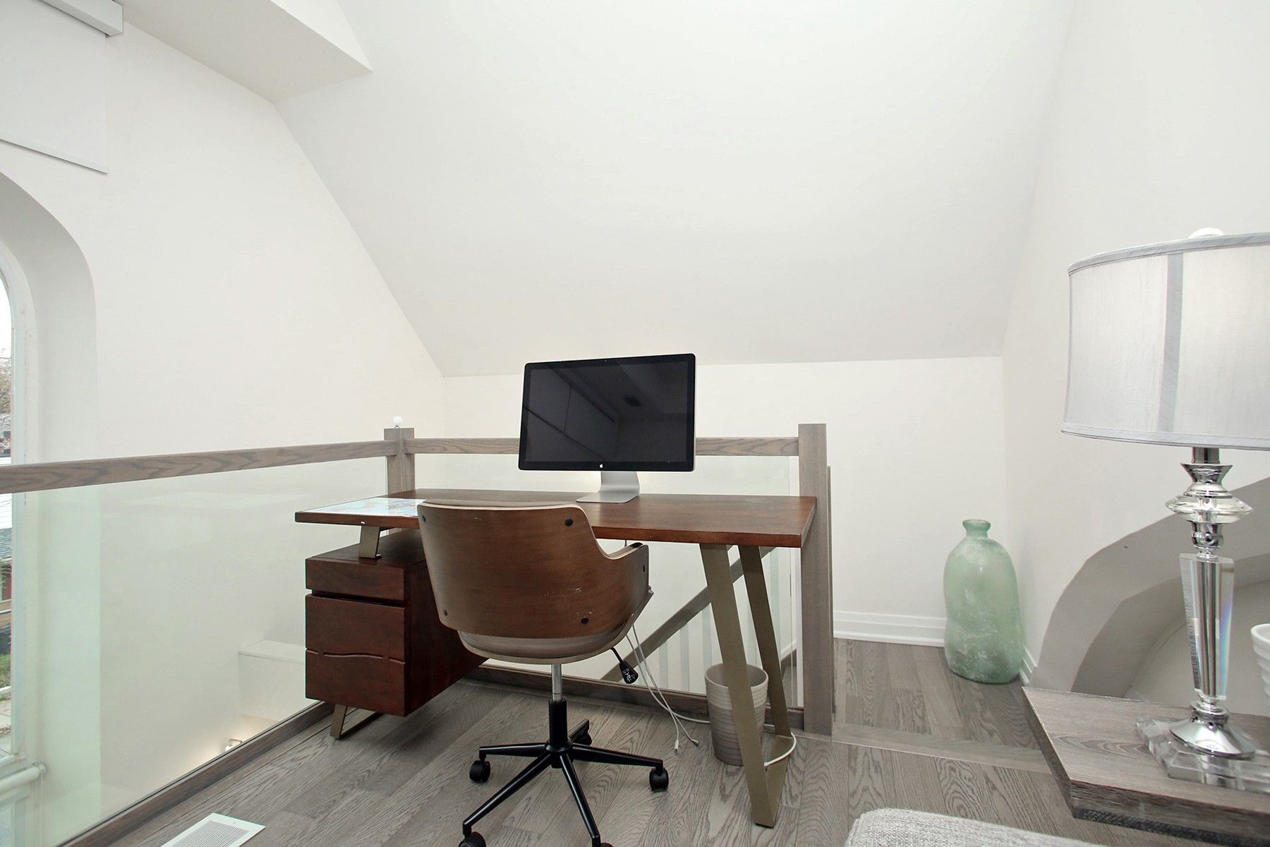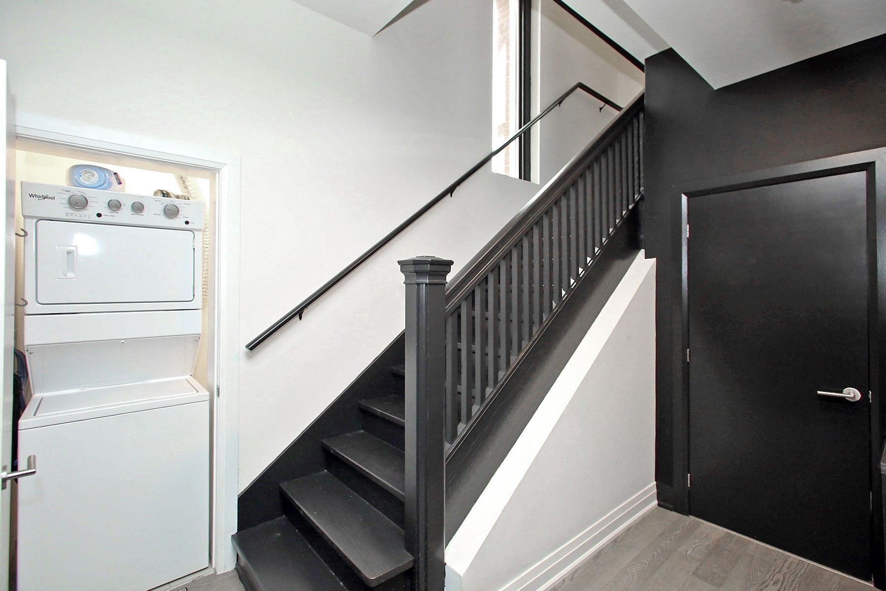 Spanning over two stories are 5 picturesque lancet windows offering loads of light. The unit boasts one bedroom plus a den, two full bathrooms, and three stories of living space. On the upper level is the loft-style living room + den, with a glass railing to overlook the impressive three lancet windows and second-level furnishings. On the 2nd level, you will find the primary bedroom, a coffee and bar area, full bathroom, and an open concept kitchen with waterfall island and an additional sitting/living area. Make your way down to the ground level and you'll find a welcoming entry with discrete laundry and ample space for inside/outside wear. This property is just steps away from some of Toronto's best restaurants, shops, and fitness centers!