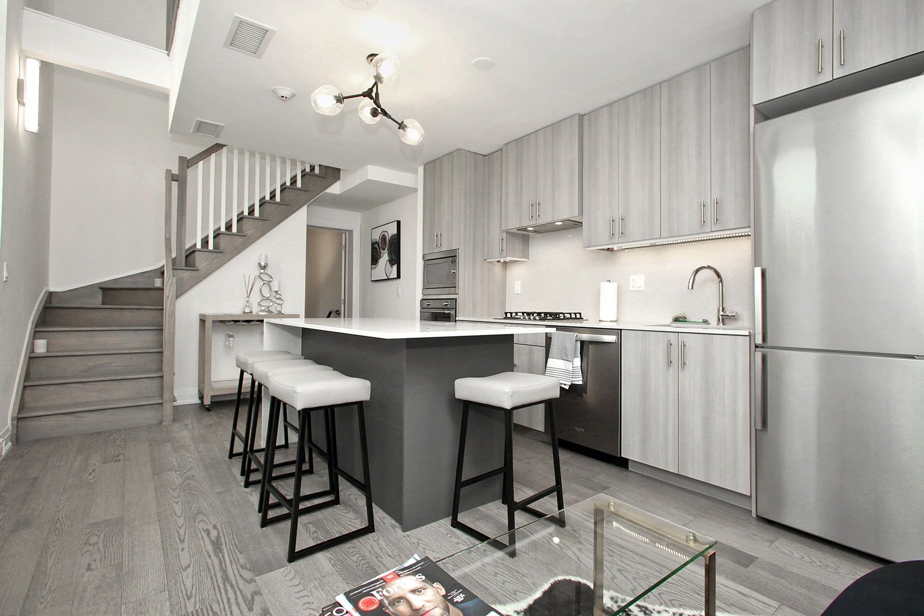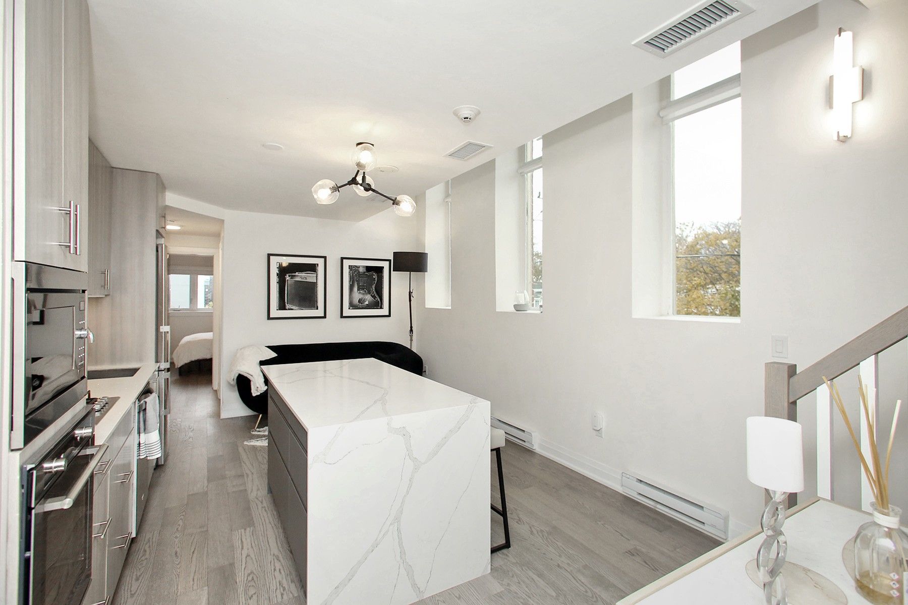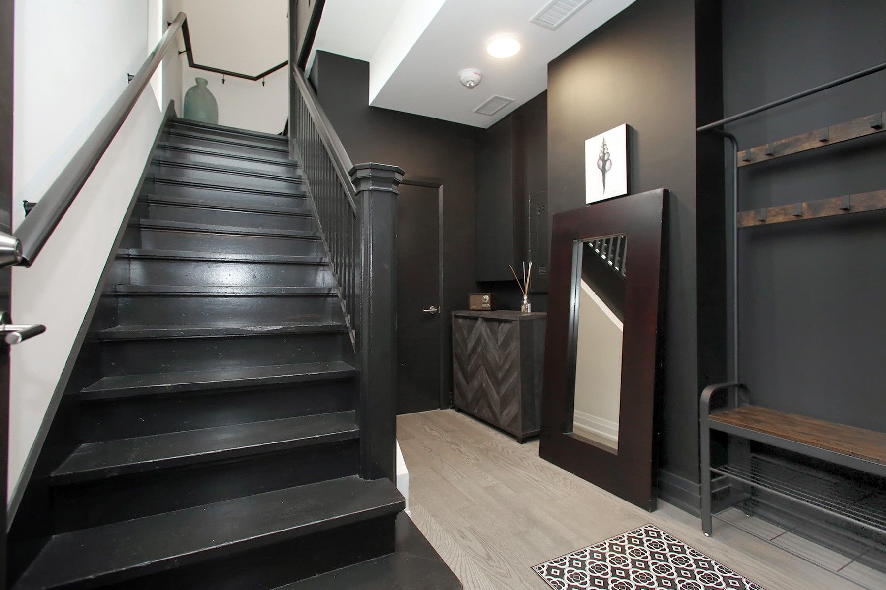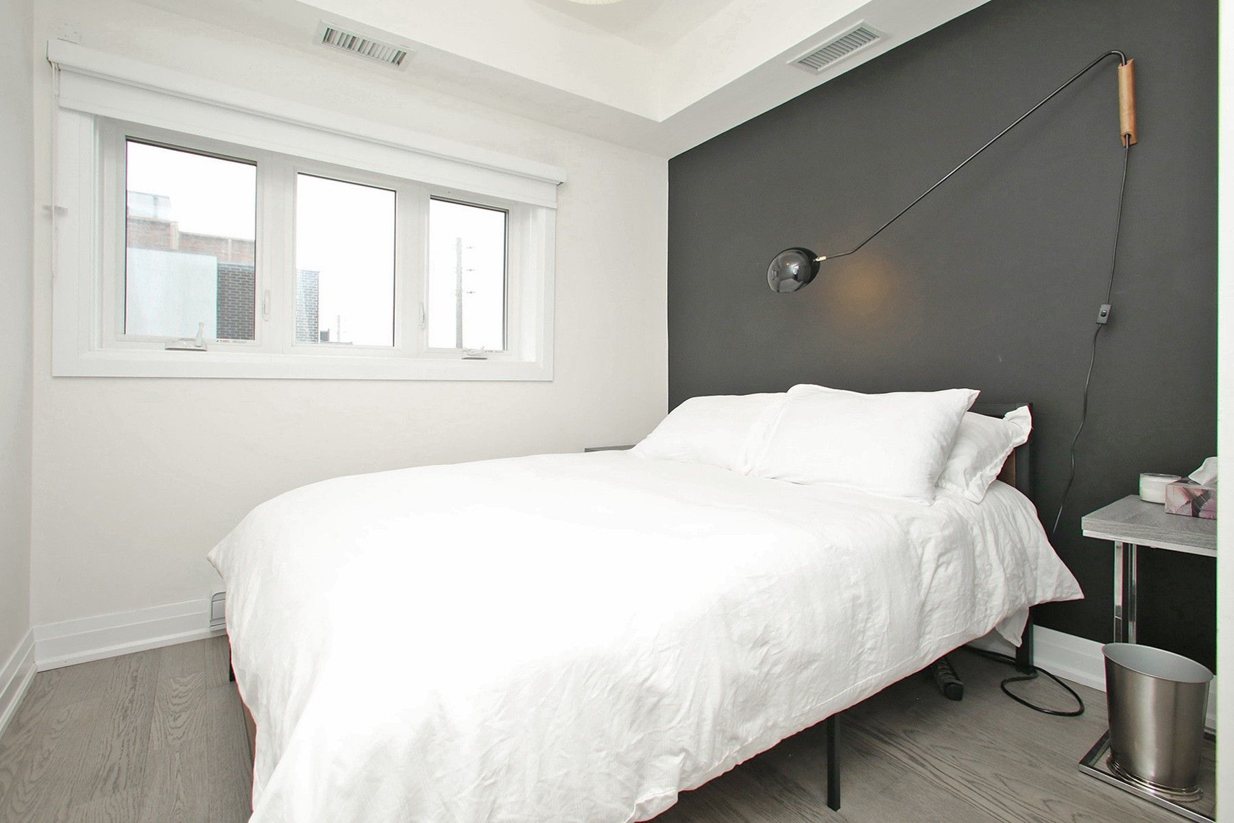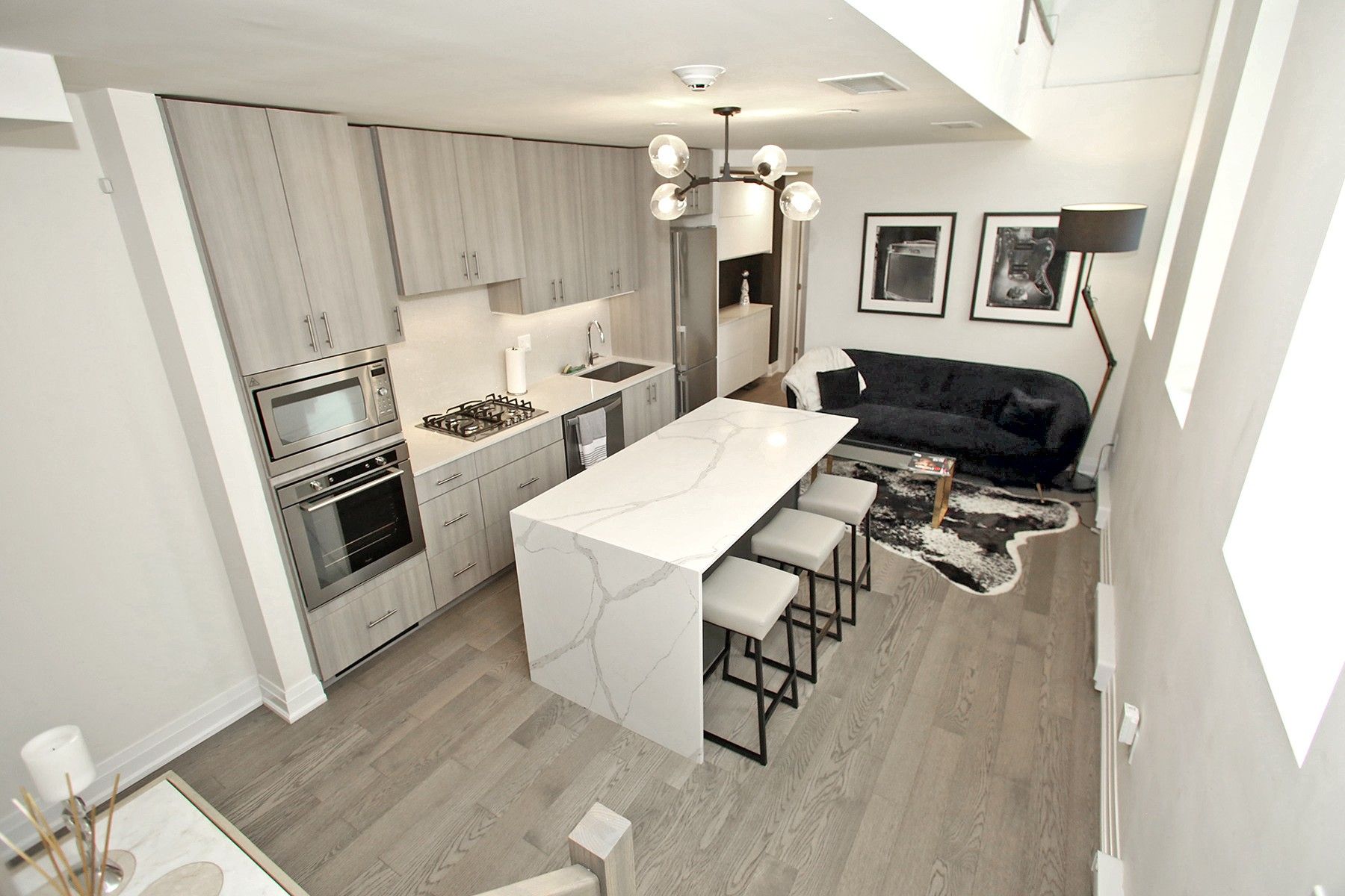 Spanning over two stories are 5 picturesque lancet windows offering loads of light. The unit boasts one bedroom plus a den, two full bathrooms, and three stories of living space. On the upper level is the loft-style living room + den, with a glass railing to overlook the impressive three lancet windows and second-level furnishings. On the 2nd level, you will find the primary bedroom, a coffee and bar area, full bathroom, and an open concept kitchen with waterfall island and an additional sitting/living area. Make your way down to the ground level and you'll find a welcoming entry with discrete laundry and ample space for inside/outside wear. This property is just steps away from some of Toronto's best restaurants, shops, and fitness centers!