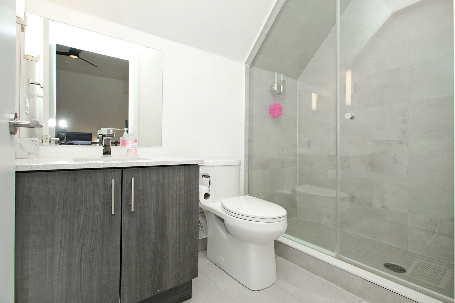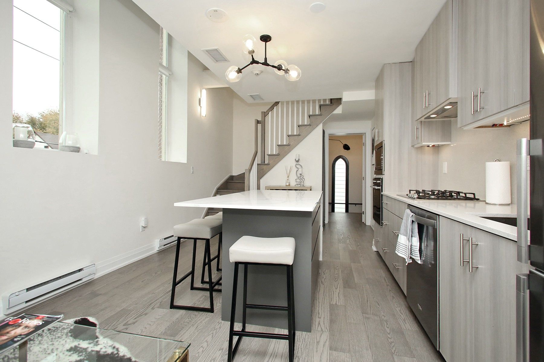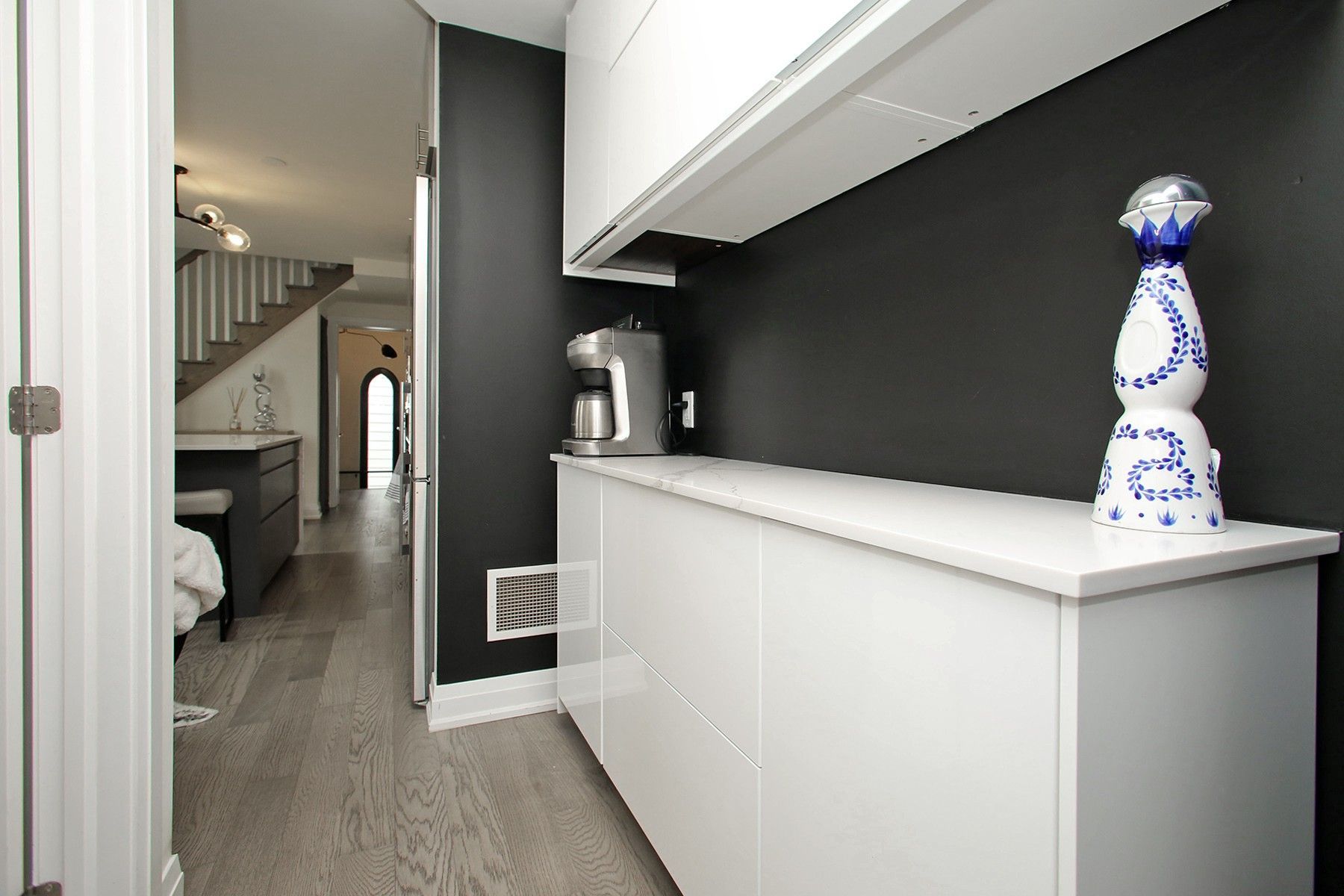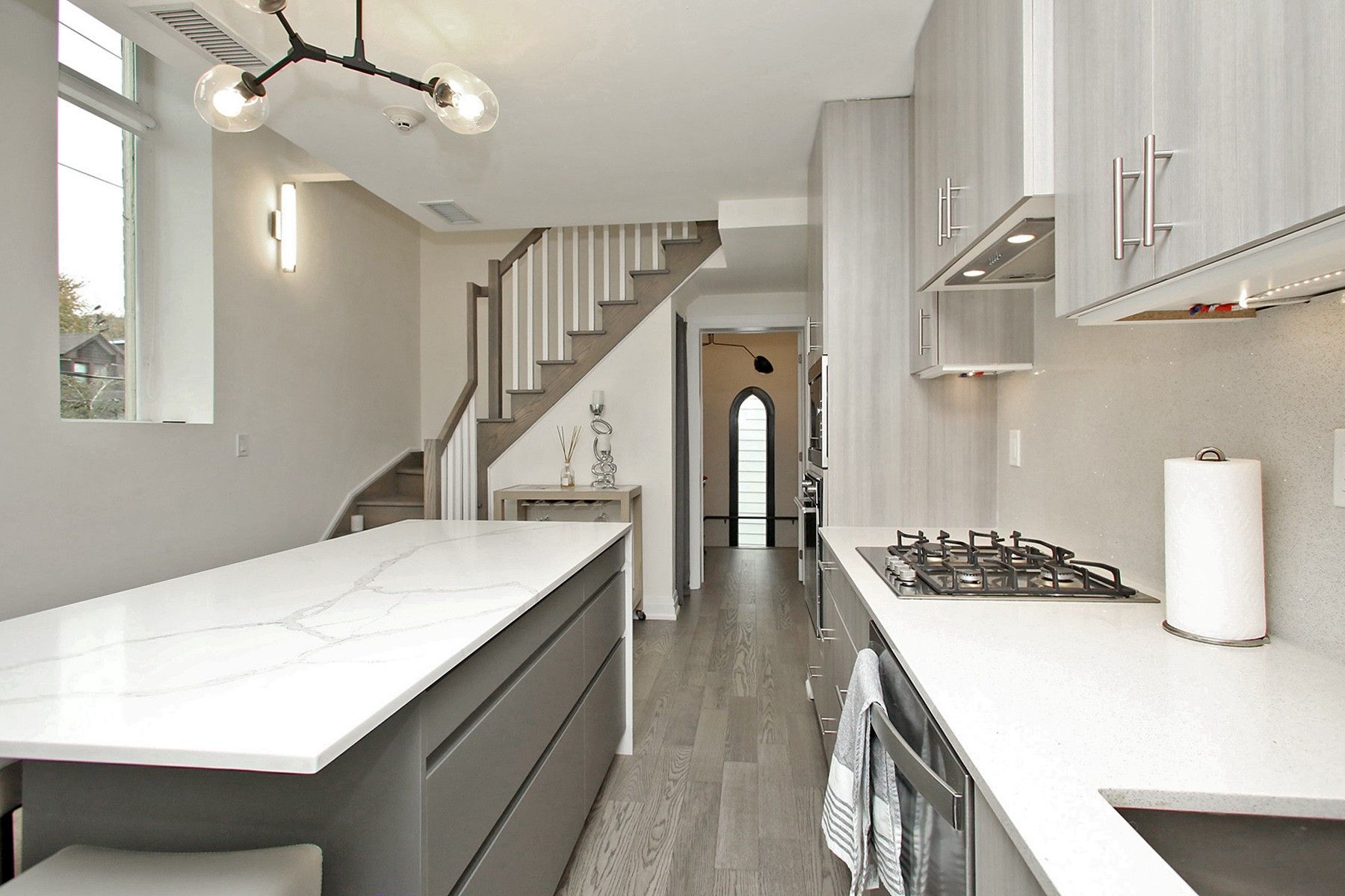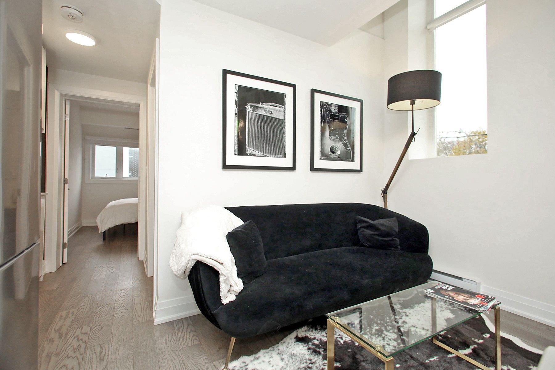 Spanning over two stories are 5 picturesque lancet windows offering loads of light. The unit boasts one bedroom plus a den, two full bathrooms, and three stories of living space. On the upper level is the loft-style living room + den, with a glass railing to overlook the impressive three lancet windows and second-level furnishings. On the 2nd level, you will find the primary bedroom, a coffee and bar area, full bathroom, and an open concept kitchen with waterfall island and an additional sitting/living area. Make your way down to the ground level and you'll find a welcoming entry with discrete laundry and ample space for inside/outside wear. This property is just steps away from some of Toronto's best restaurants, shops, and fitness centers!