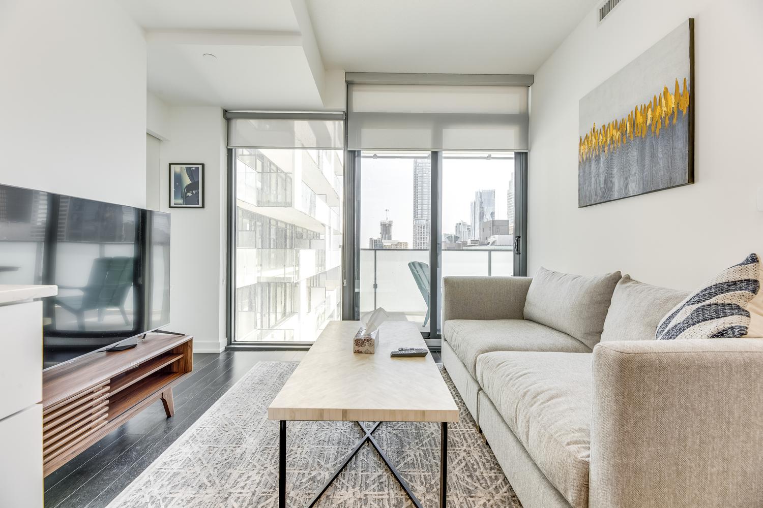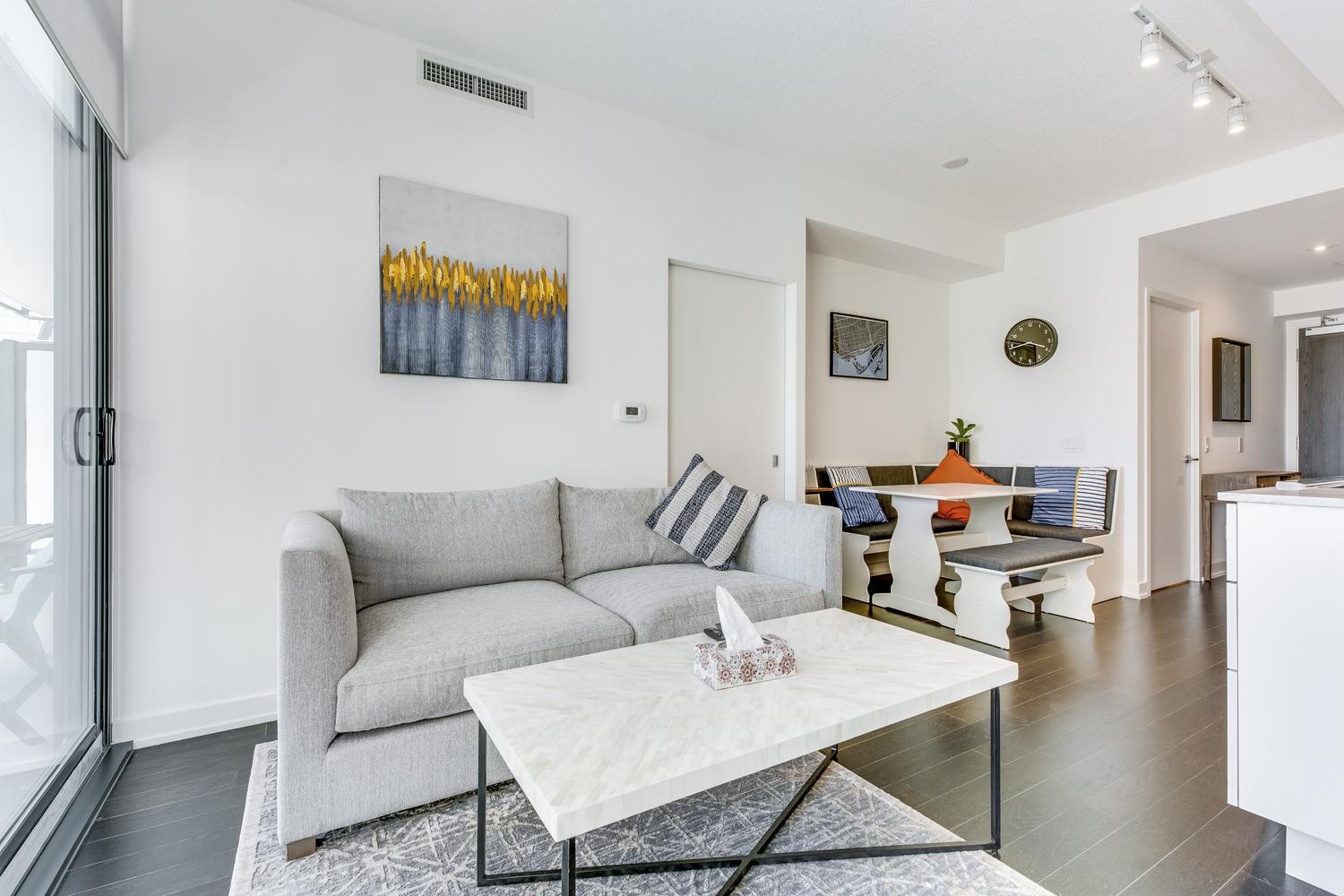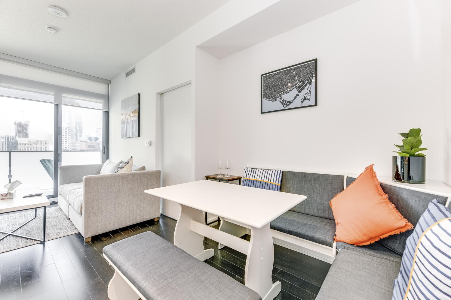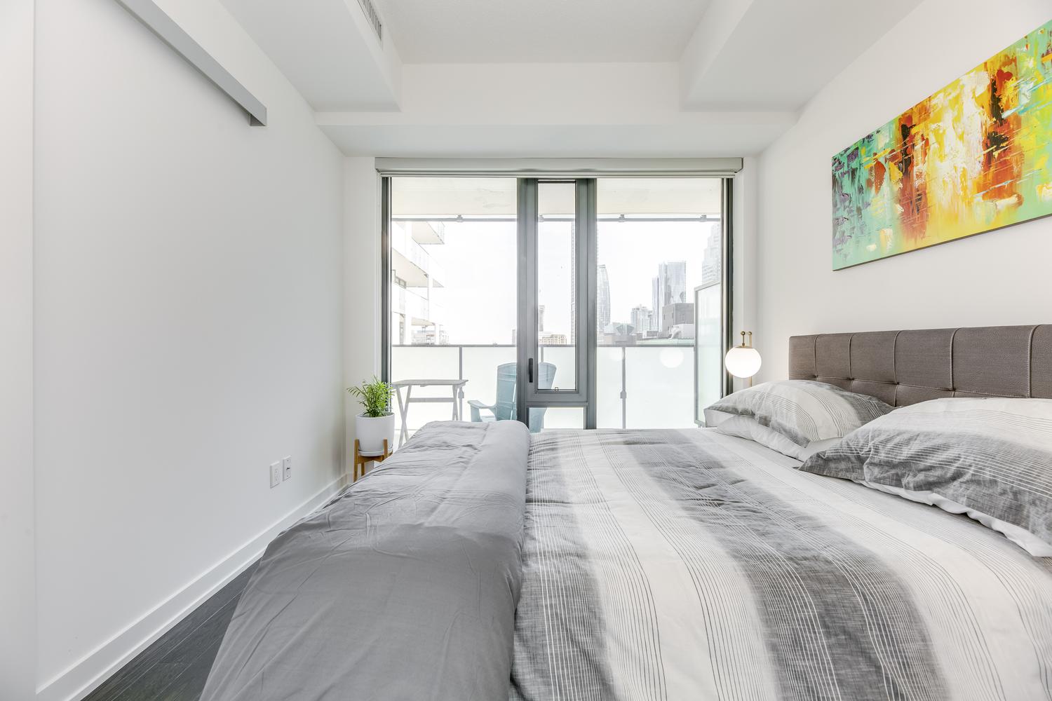 Modern unit with floor-to-ceiling windows! This 1 bedroom, 2 bathroom, plus solarium unit is located in Toronto's downtown core. This unit has in-suite laundry. All utilities are included in the rental rate amount (hydro, water, and internet). Fully furnished with modern and clean decorations and as seen in the photos. All bed linens, towels, pots/pans, utensils, etc. are there for your enjoyment. This home awaits you!