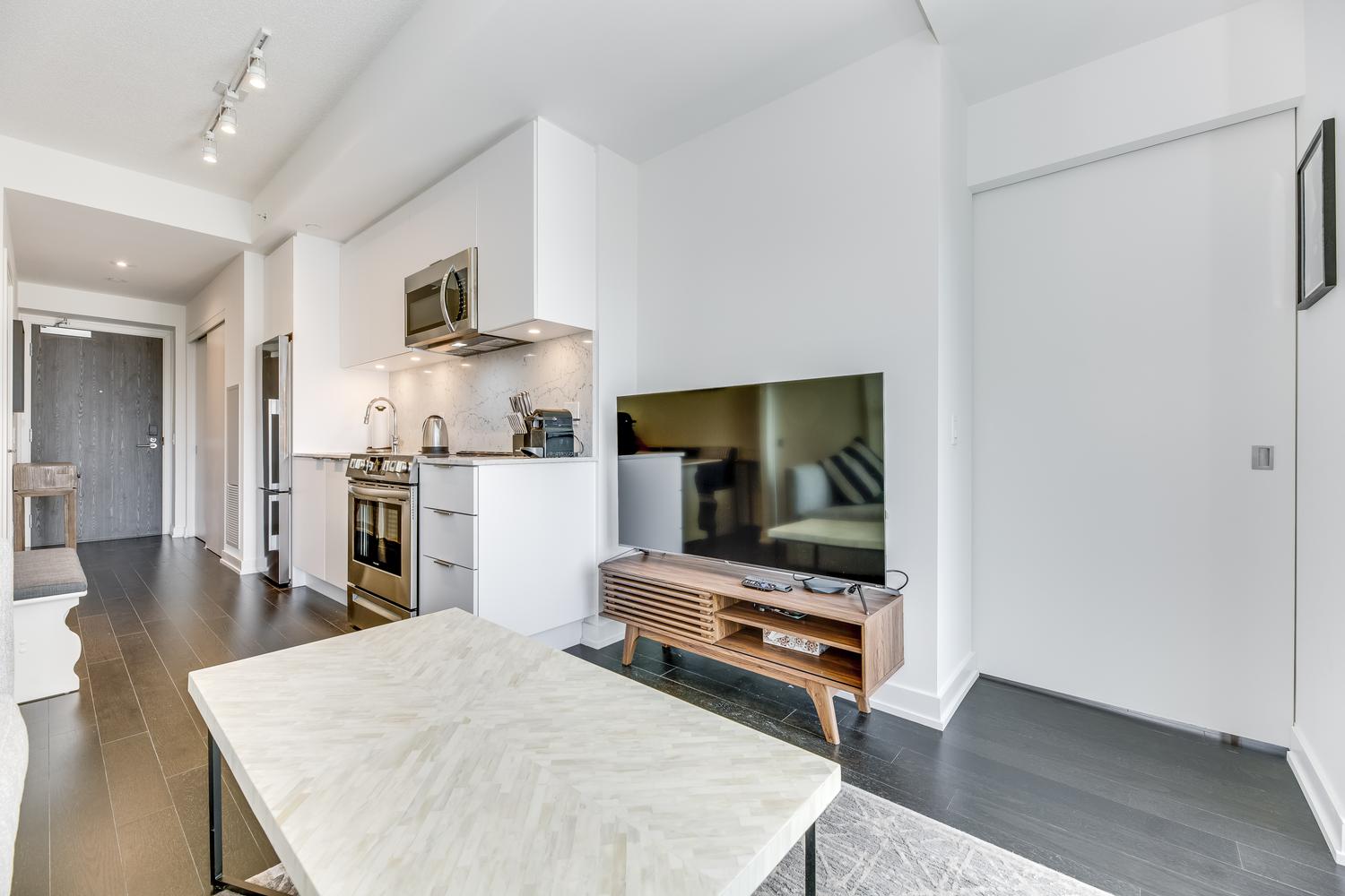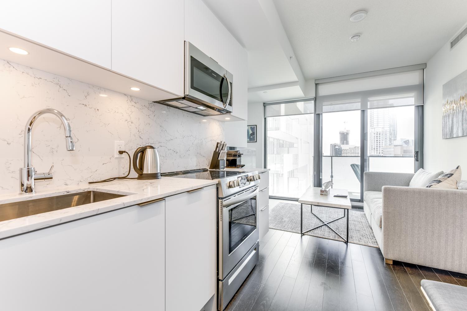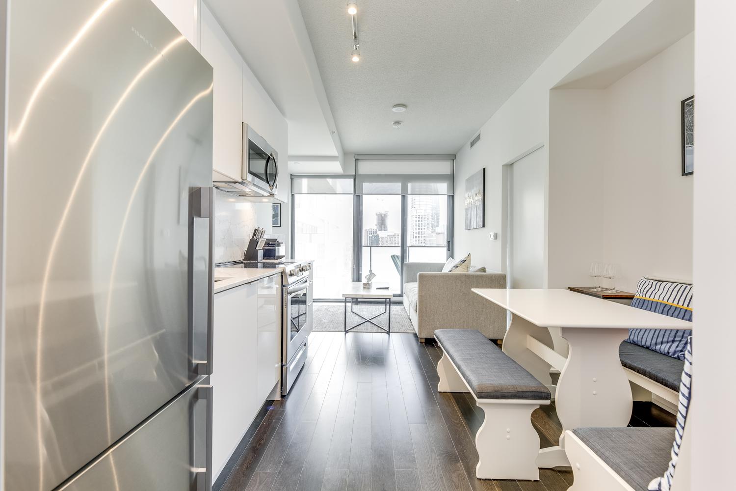 Modern unit with floor-to-ceiling windows! This 1 bedroom, 2 bathroom, plus solarium unit is located in Toronto's downtown core. This unit has in-suite laundry. All utilities are included in the rental rate amount (hydro, water, and internet). Fully furnished with modern and clean decorations and as seen in the photos. All bed linens, towels, pots/pans, utensils, etc. are there for your enjoyment. This home awaits you!
