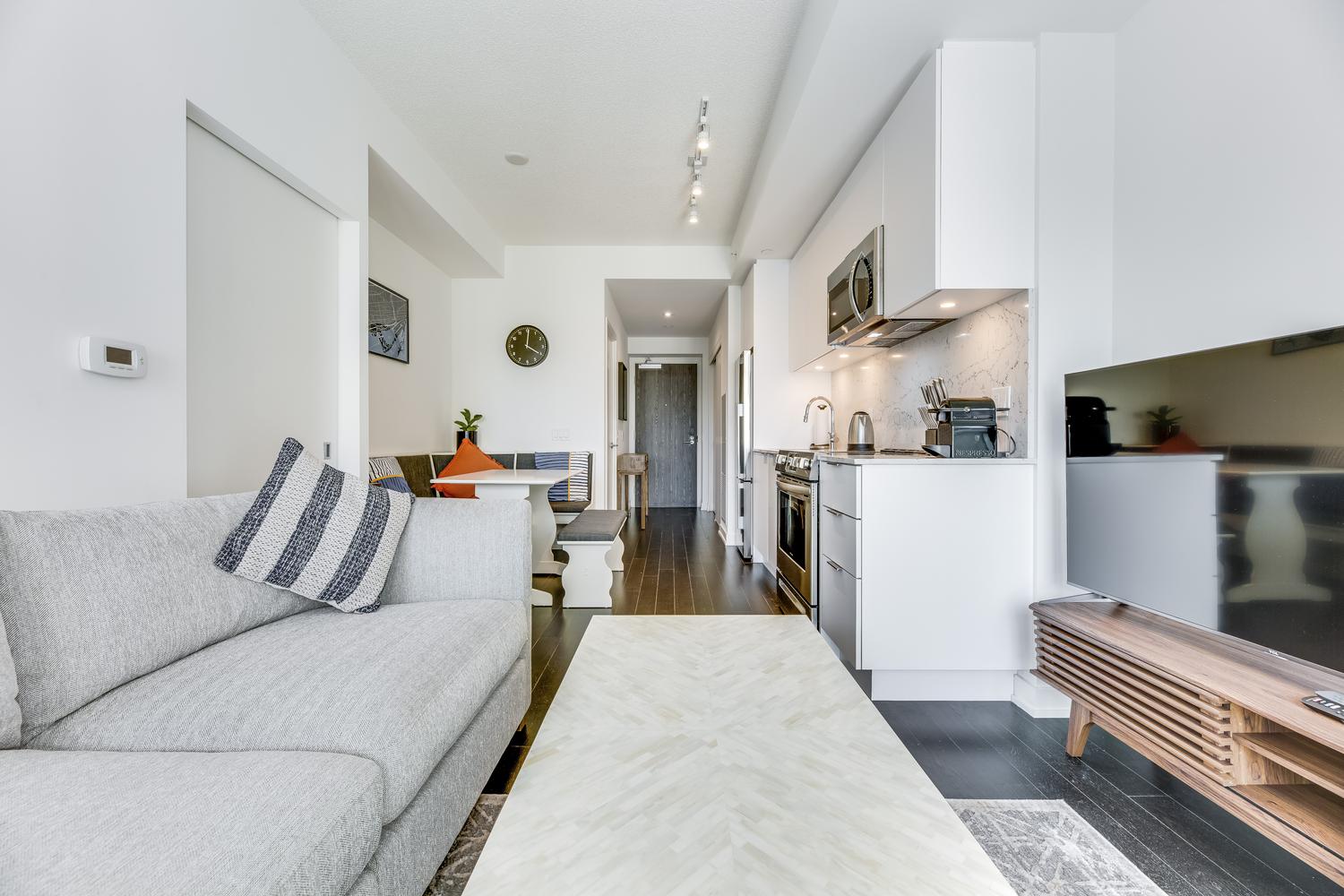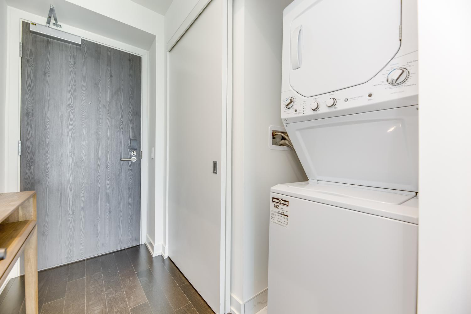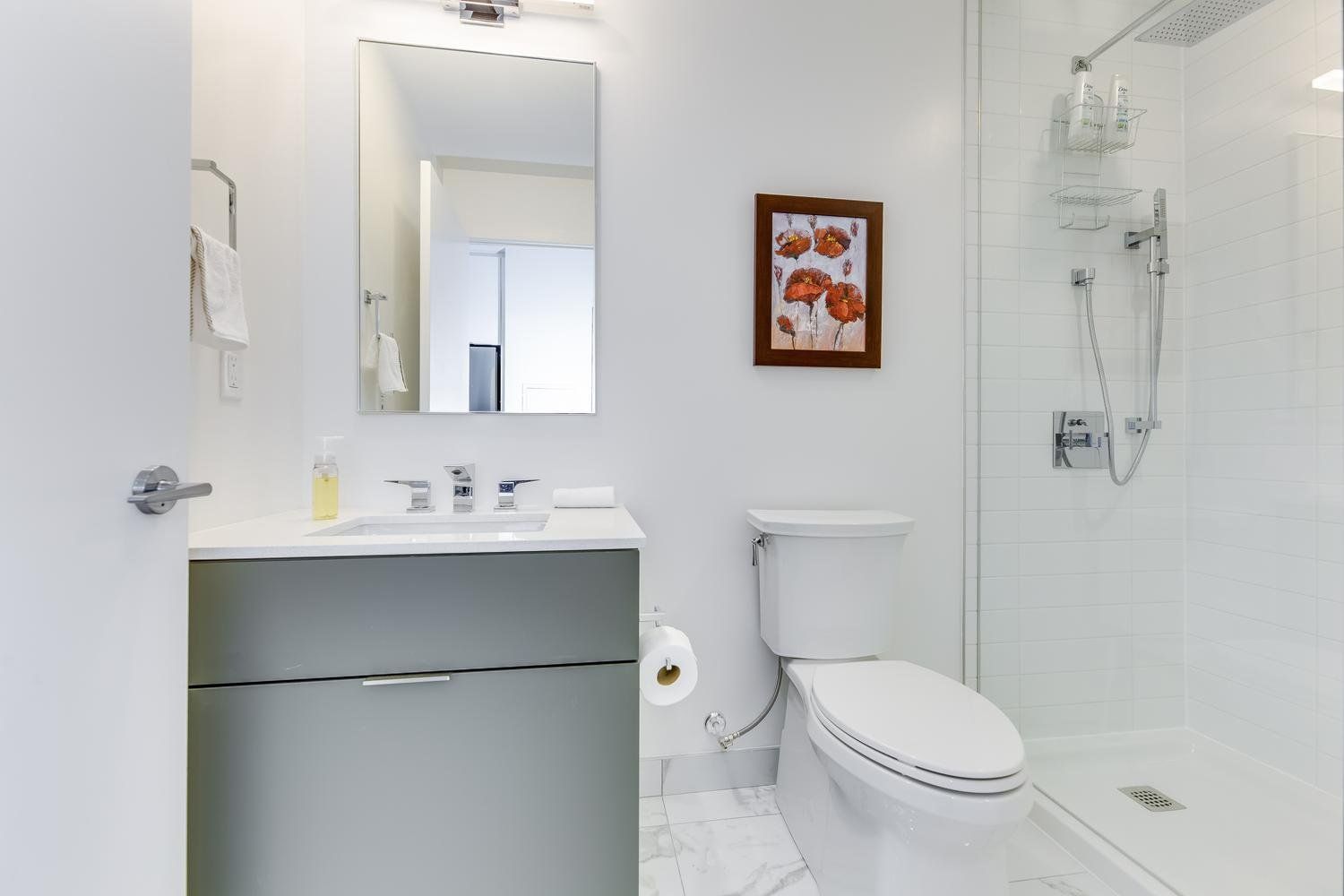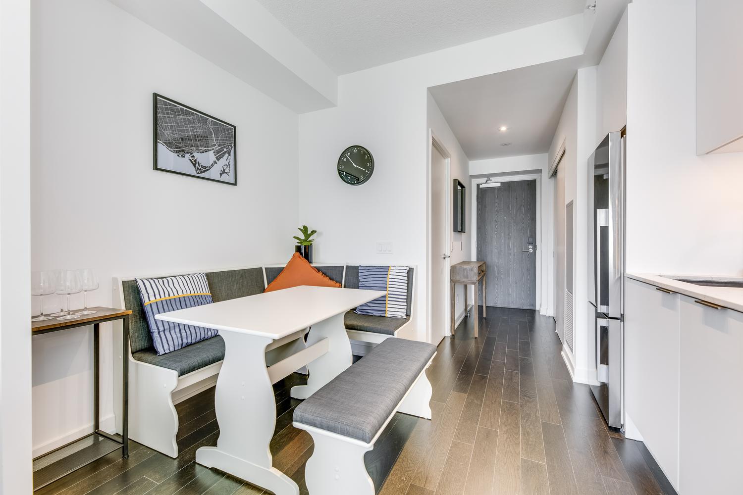 Modern unit with floor-to-ceiling windows! This 1 bedroom, 2 bathroom, plus solarium unit is located in Toronto's downtown core. This unit has in-suite laundry. All utilities are included in the rental rate amount (hydro, water, and internet). Fully furnished with modern and clean decorations and as seen in the photos. All bed linens, towels, pots/pans, utensils, etc. are there for your enjoyment. This home awaits you!
