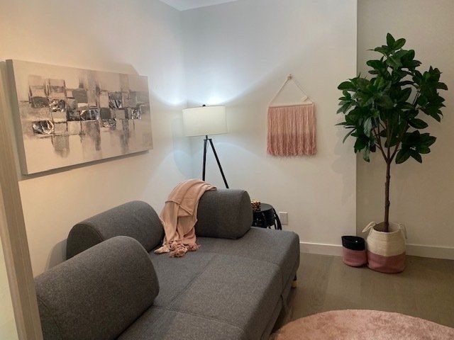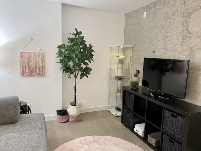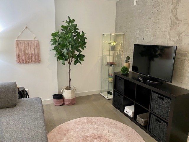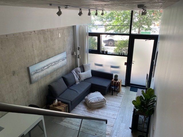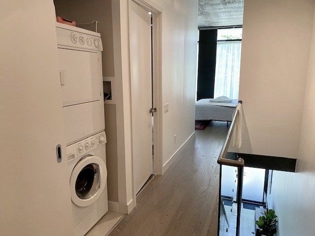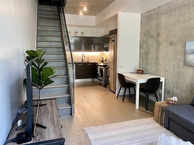 Enjoy 803 square feet of living space in this 1 bedroom + den, 1 bathroom Toronto furnished townhouse rental. With high ceilings, floor-to-ceiling windows, a furnished front patio, and ample natural light this two-story townhouse is the perfect place to call home. The tastefully decorated main floor has a living room, complete with L-shaped couch, flat-screen TV, and a dining table with seating for 2. Take advantage of the open concept kitchen, which boasts quartz countertops, integrated stainless steel appliances, and a pantry for ample storage space. Make your way upstairs to the top of the stairs where you'll find the office area complete with a desk and chair. Next to the office sits the second bedroom. Currently, the second bedroom is set up as a second living area with a large couch (which can be used as a temporary second bedroom by rearranging the cushions to offer a double bed), flat screen TV, and storage. Make your way along the hall for the closet and stacked laundry, full bathroom, and the primary suite.