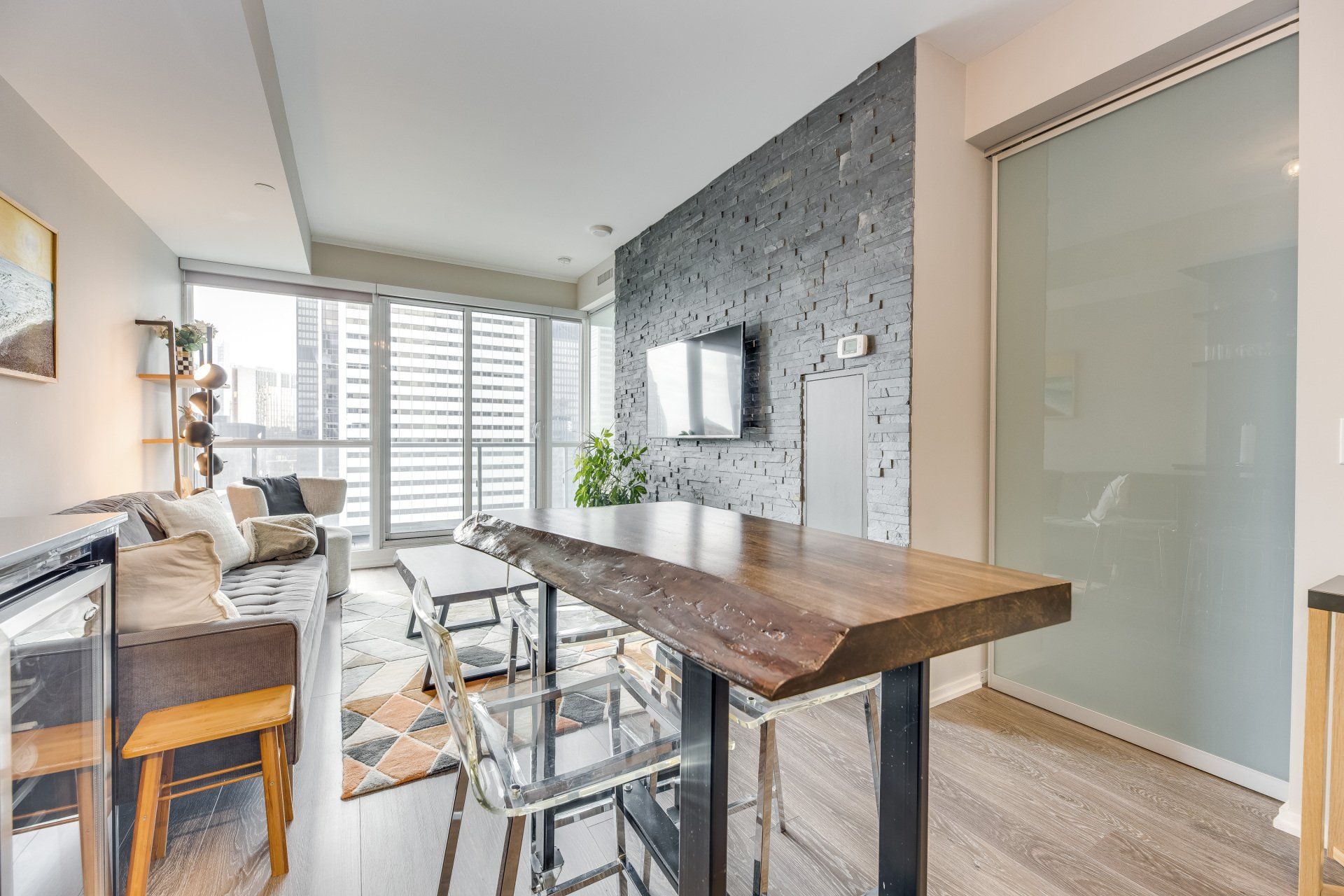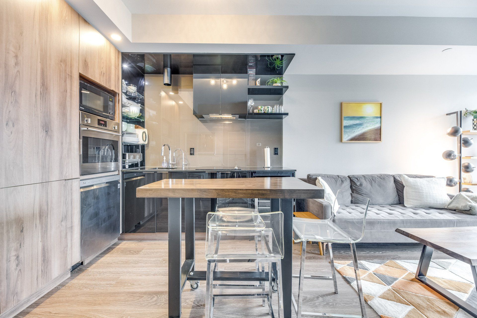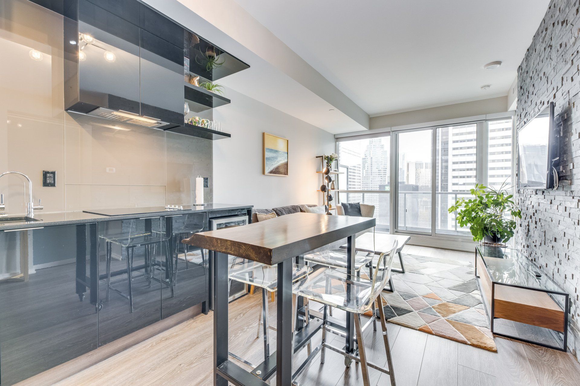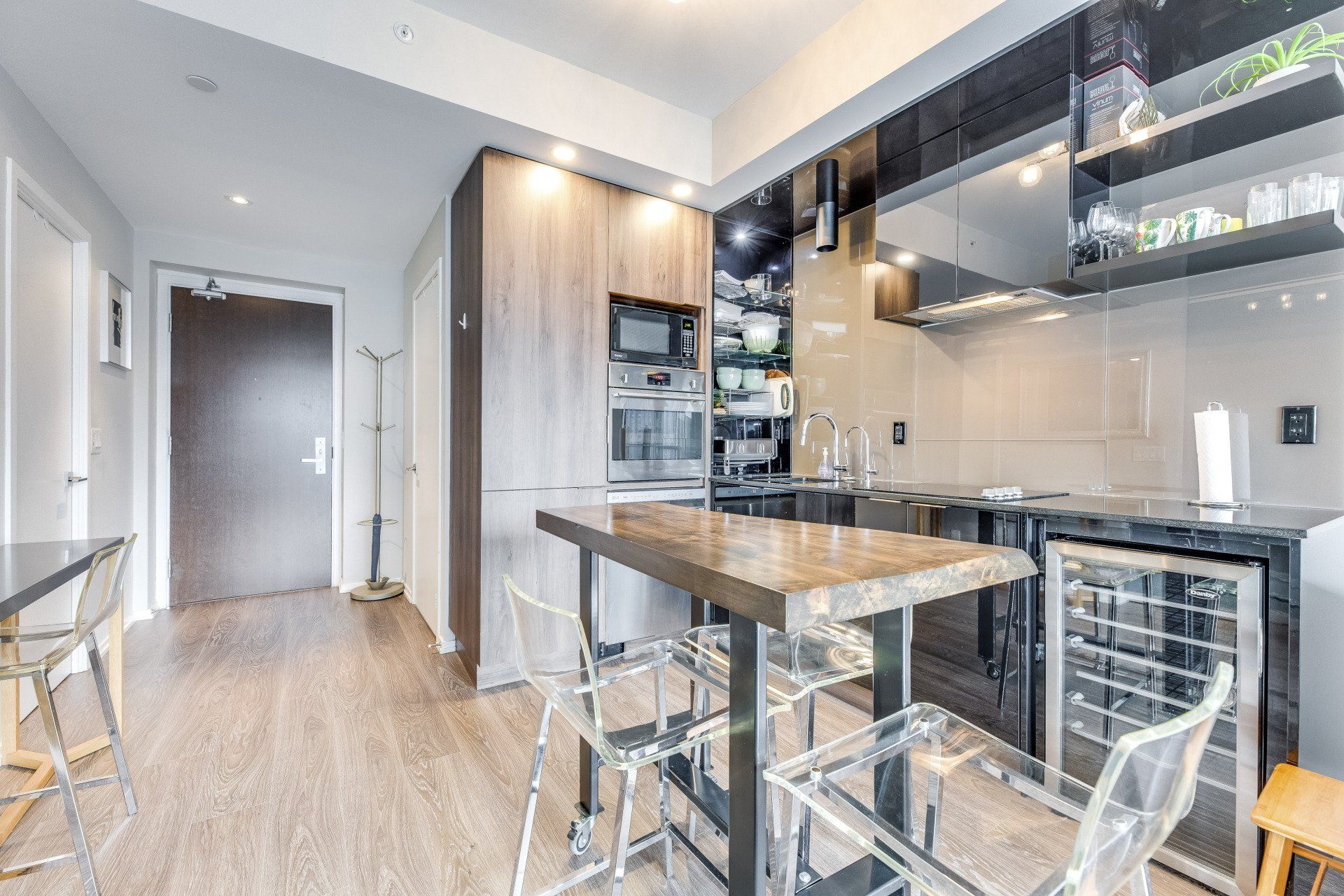You'll find this modern 1 bed + den in the heart of it all! Close to shops and TTC this is a dream rental. The live edge island makes this rental perfect for entertaining friends. The bed is absolutely fantastic with floor-to-ceiling windows and ample storage. A large in-suite laundry room is a rare find in downtown living. You'll be taken away with the city lights at night on your balcony. The murphy desk/bed allows you to work from home and entertain a short-term guest.